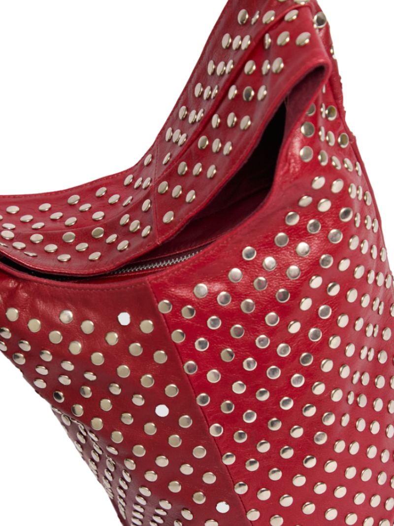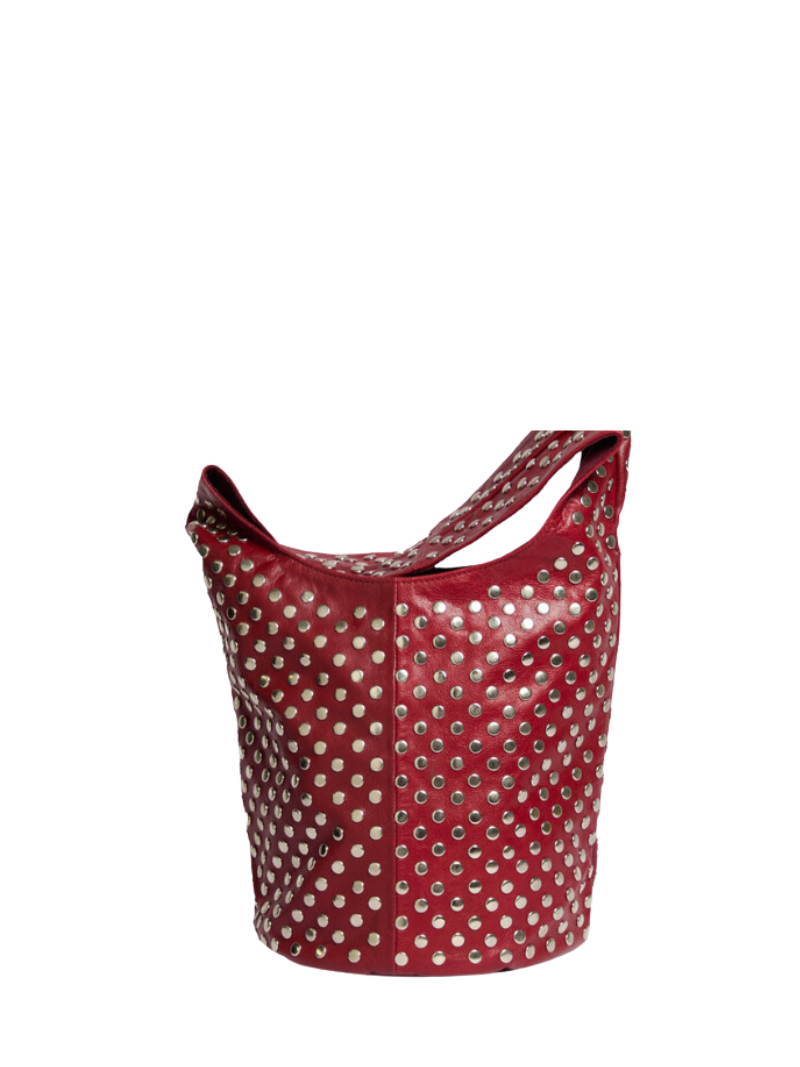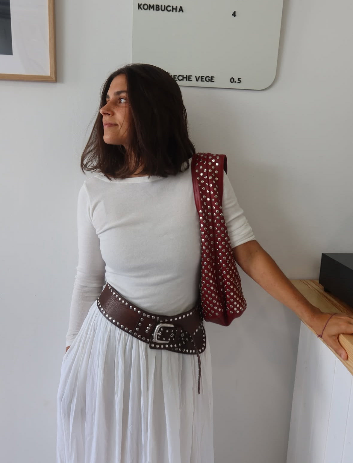 The Airlie medium burgundy bag is the ideal accessory for those looking for style and functionality. Made from high-quality leather, this bag stands out for its vibrant white color, complemented by silver metallic studs that give it an edgy and sophisticated touch. Its compact design makes it the perfect companion to carry the essentials on any outing, adding a bold and modern touch to any look. Elevate your outfit with this bag with a bold design and unique details.