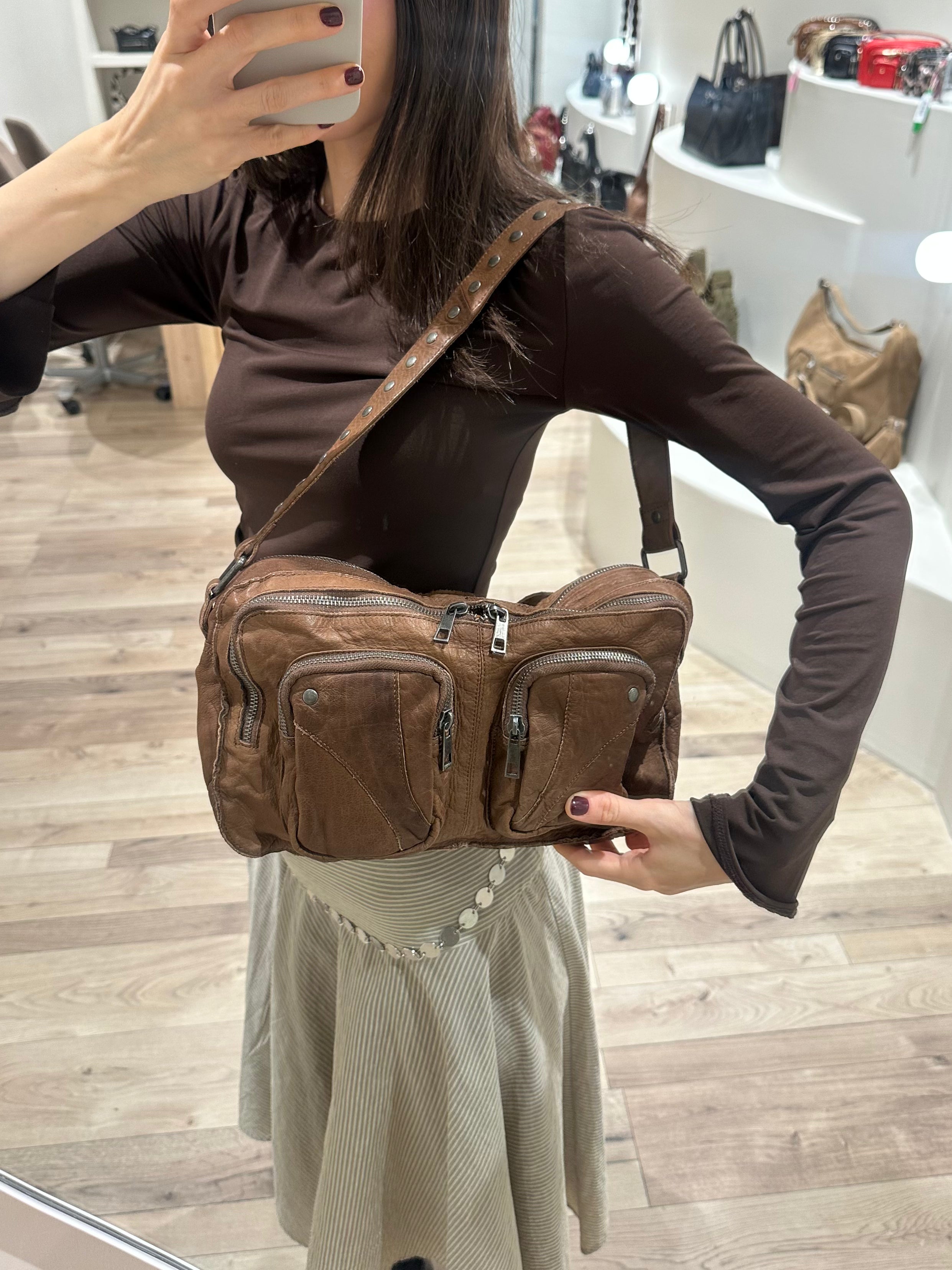 Medium black leather bag with antique silver details. Crafted from high-quality washed leather, this bag combines durability with timeless style. It features multiple front zippered pockets and an adjustable strap with metallic accents, making it a practical and comfortable everyday bag. Perfect for carrying across your body or over your shoulder.