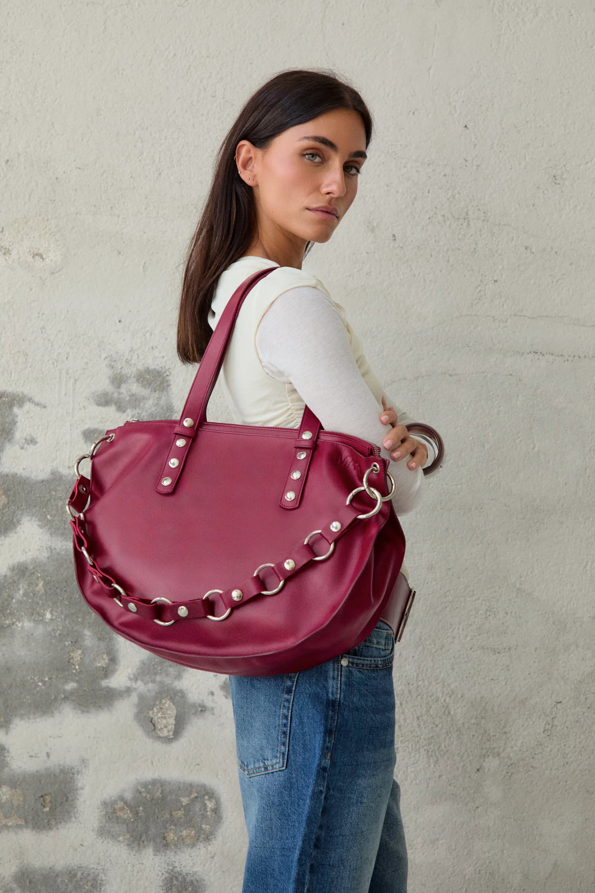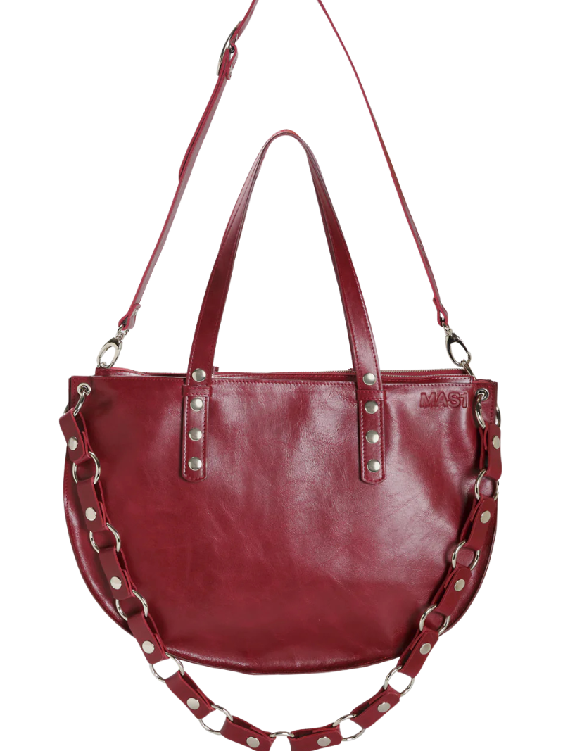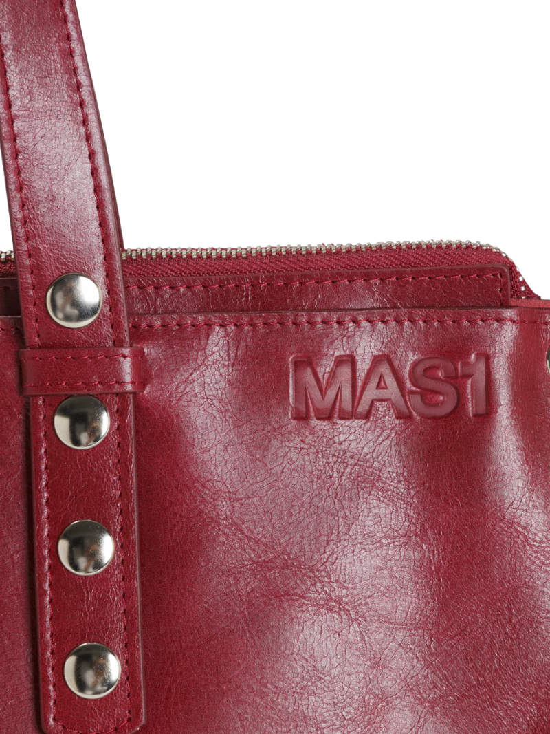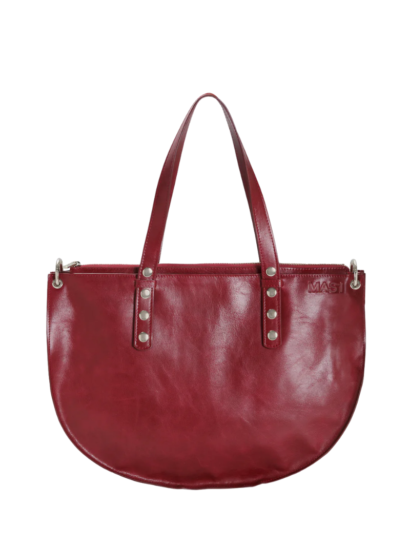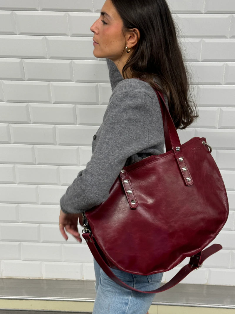 Shopper bag in a sophisticated burgundy color, crafted from LWG-certified cowhide, ensuring quality and sustainability. Its elegant design features a discreet "MAS1" logo engraving on the front. With adjustable shoulder straps, this bag combines style and functionality, while being spacious enough to comfortably carry a laptop. Ideal for everyday use.
