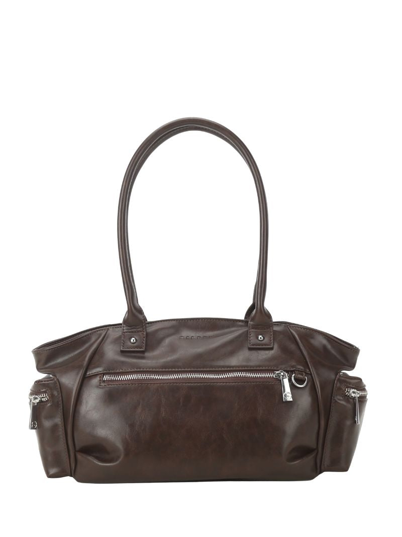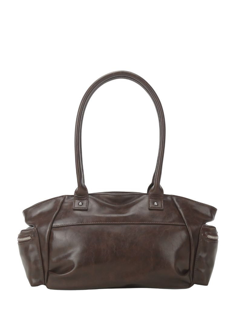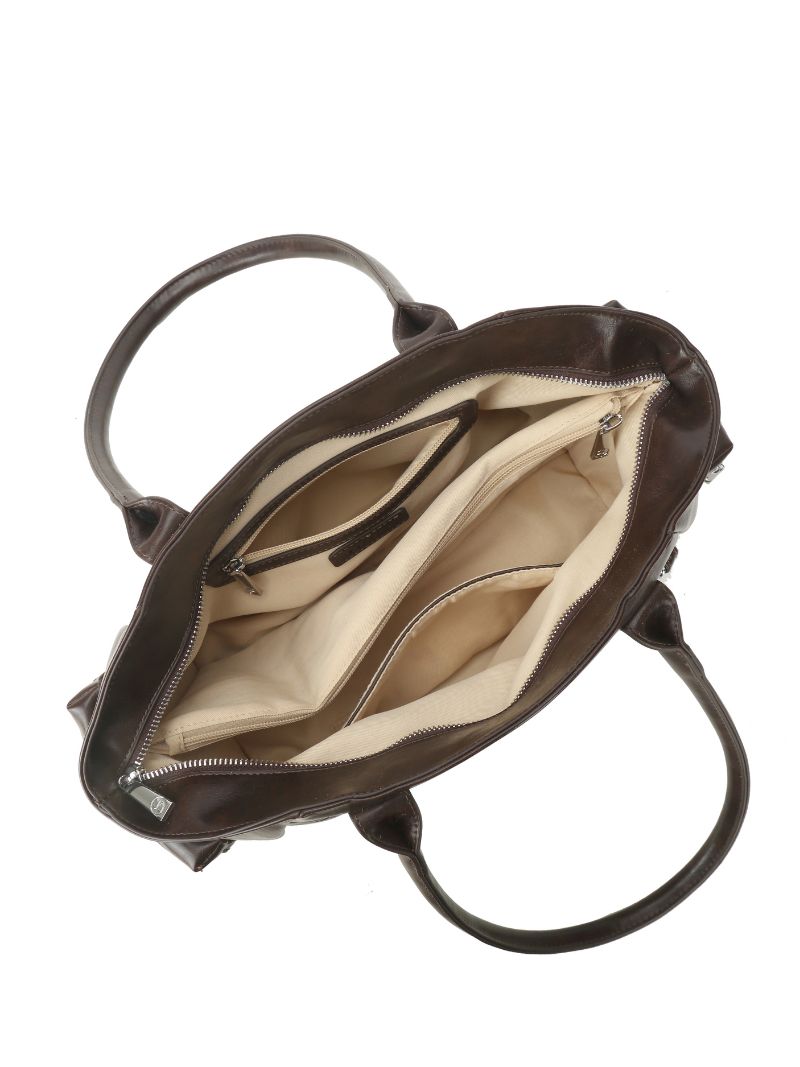 Medium-sized bag in chocolate brown, spacious and practical. A bag to accompany you to work, class, or your everyday life. It's made of a soft, leather-like material and has long, comfortable handles for carrying over the shoulder.