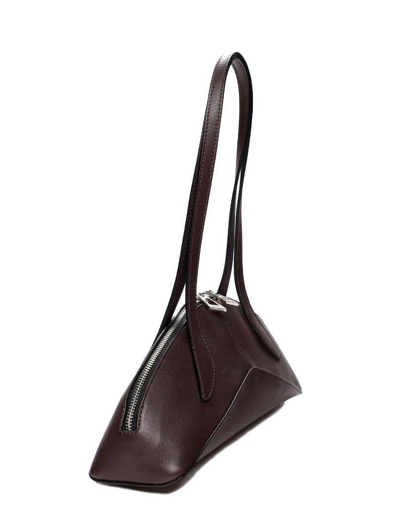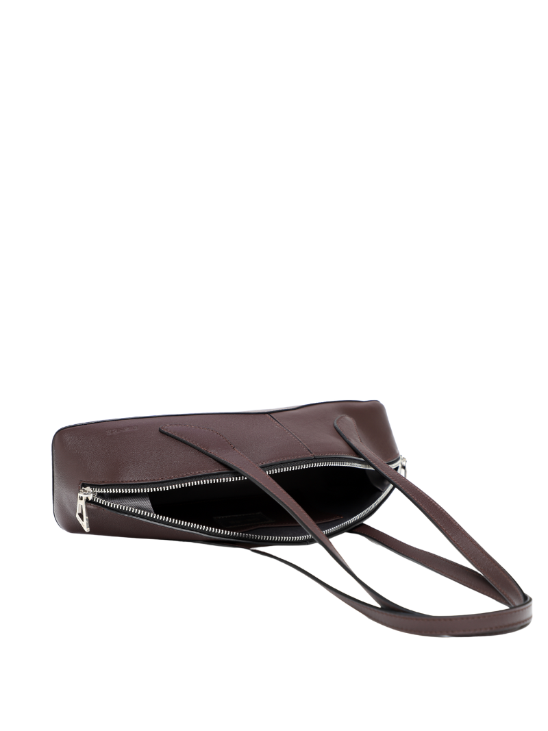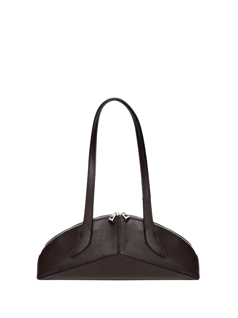 The chocolate brown Arco bag is a contemporary design crafted from genuine leather with a soft finish, adding an elegant touch to any look. Its curved and structured silhouette, inspired by architectural lines, makes it a unique and eye-catching accessory.