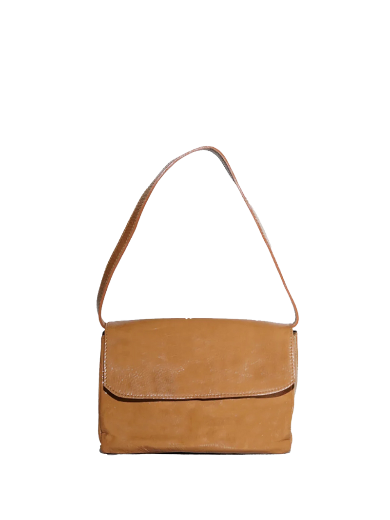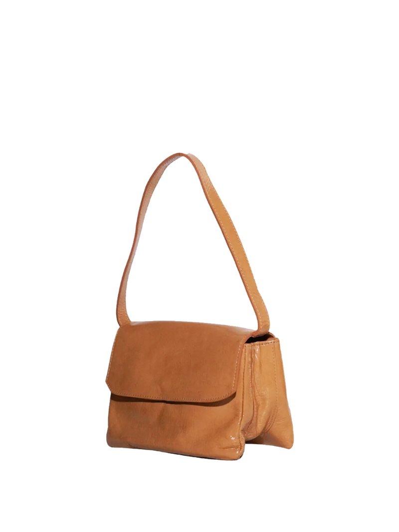 Small leather shoulder bag in camel color. The Babe model is made of 100% leather, which gives it a wrinkled appearance, but with great softness and luminosity.