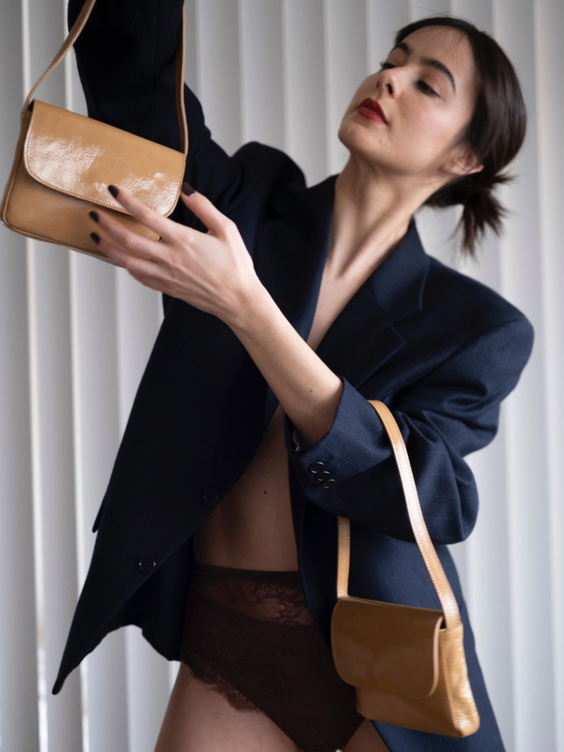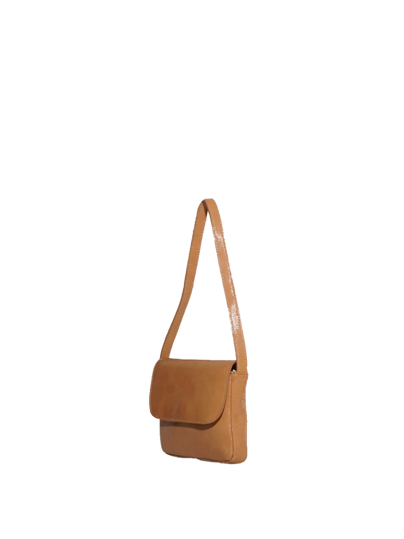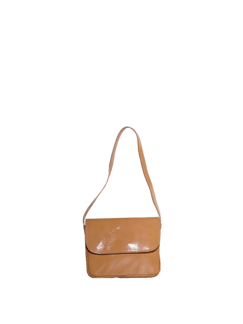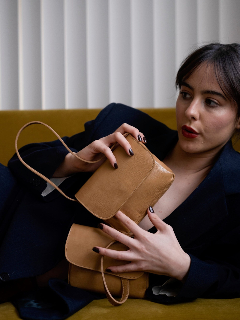 Small brown leather shoulder bag. The Baby model is made of 100% leather, which gives it a wrinkled appearance, but with great softness and lightness.