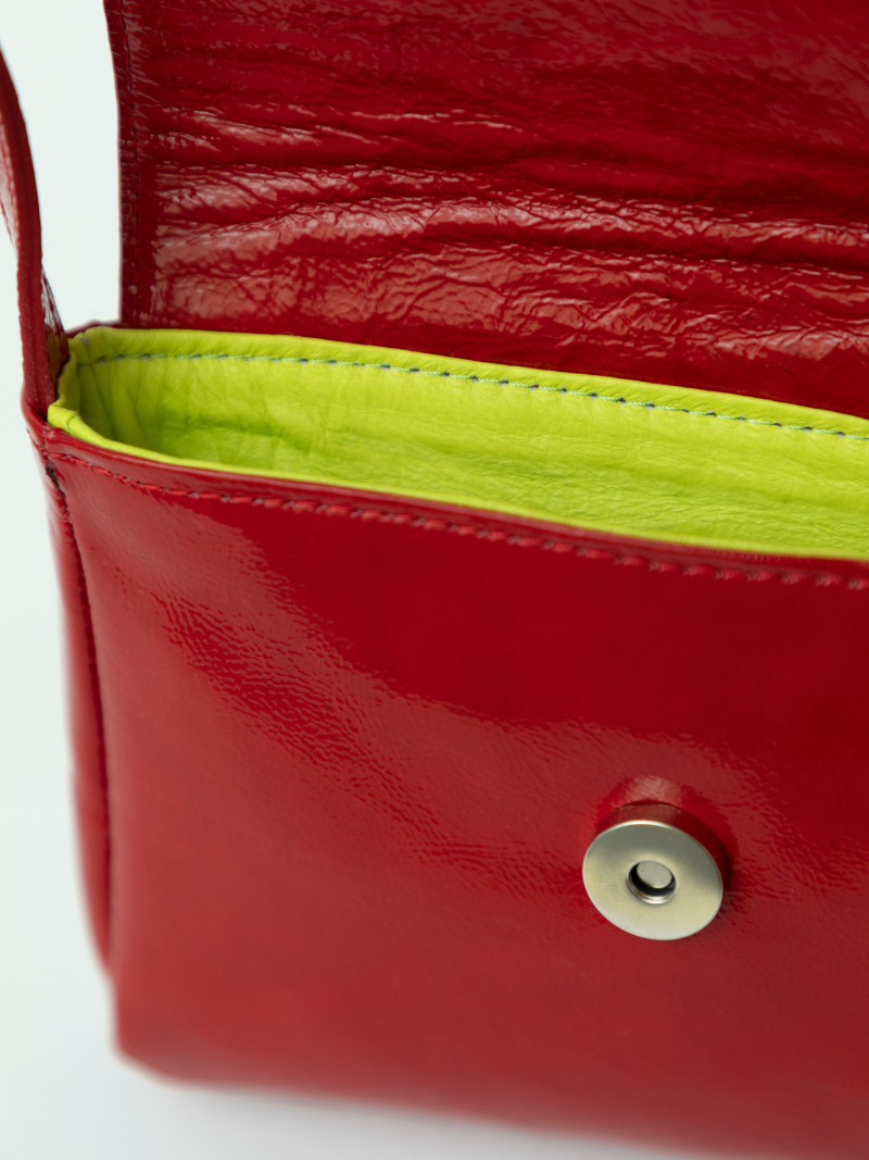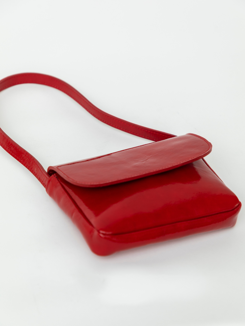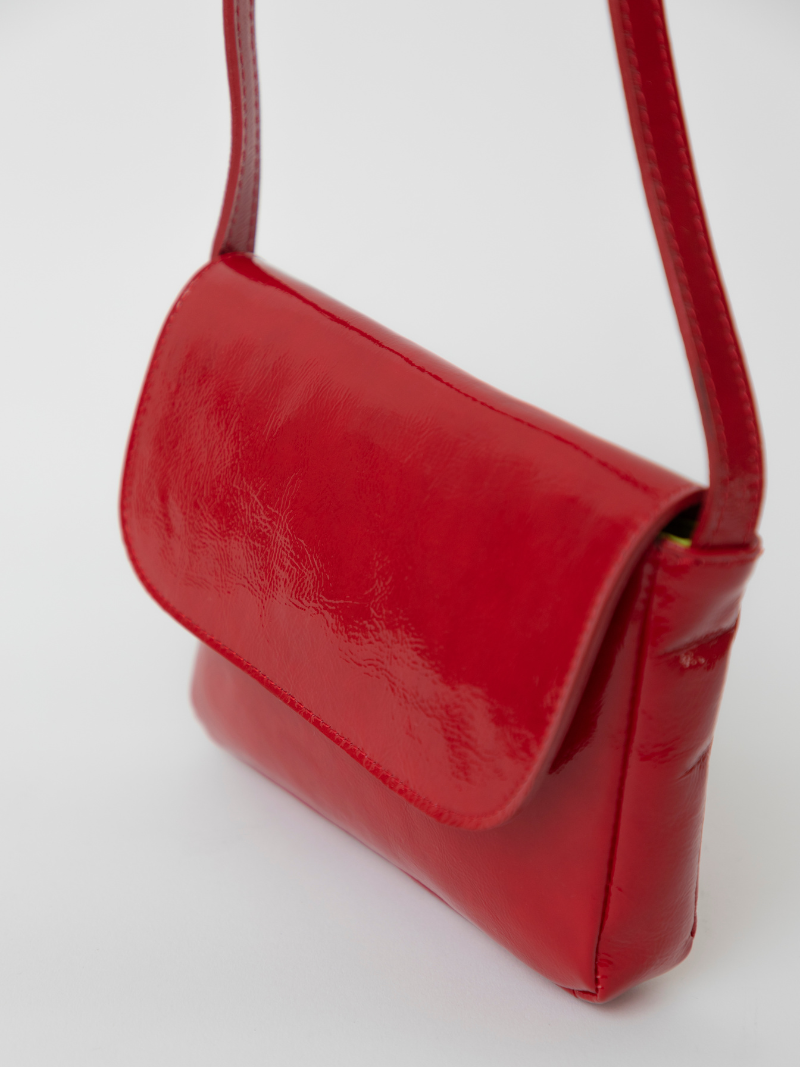 Small red leather shoulder bag. The Baby model is made of 100% leather, which gives it a wrinkled appearance, but with great softness and lightness.