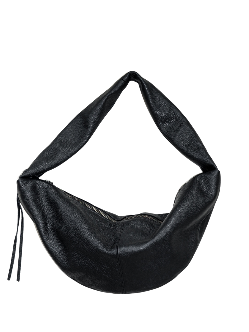 Black leather bag with a 100% cotton lining. This bag closes with a zipper and features a leather handles.