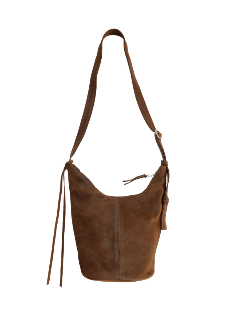 Timeless bucket bag with a feminine, curved design in brown suede, crafted from textured Italian leather. This compact and functional crossbody bag is perfect for carrying your daily essentials with style and security.