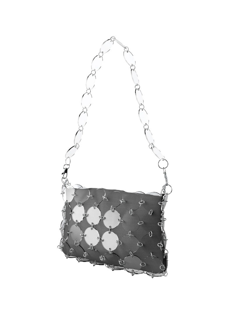 Medium crossbody bag made of transparent methacrylate and glitter interior cover with zipper closure. 85 cm transparent methacrylate sheet chain to match the bag.