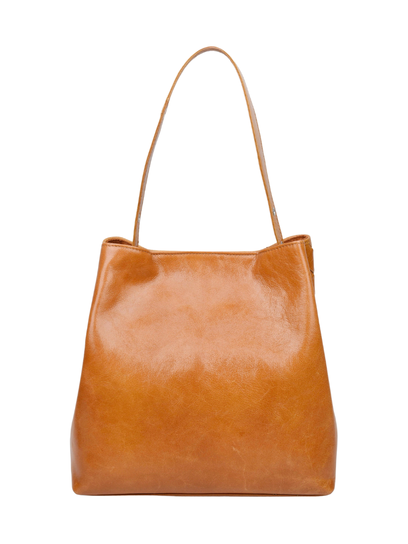 Large orange-brown leather shoulder bag. It features a spacious main compartment that closes securely with a magnetic closure, offering comfort and security. The adjustable strap ensures a comfortable fit all day long.