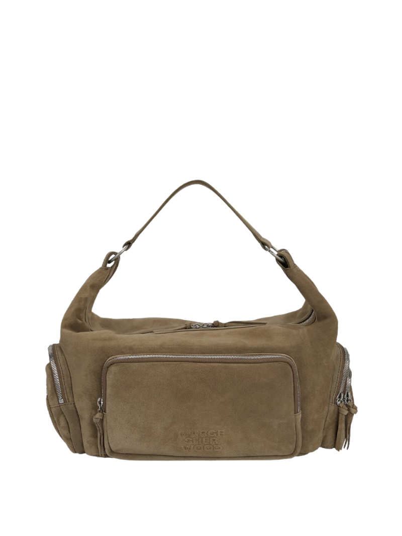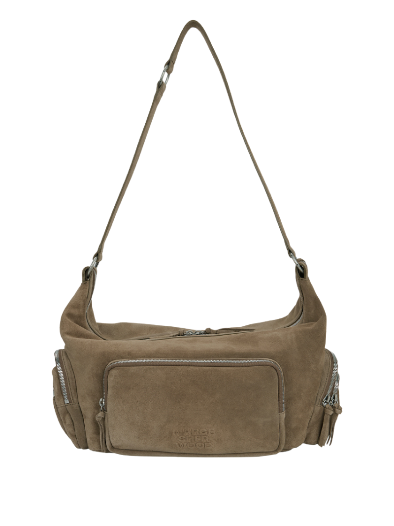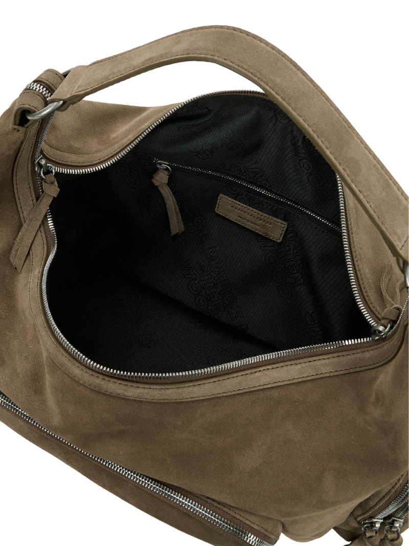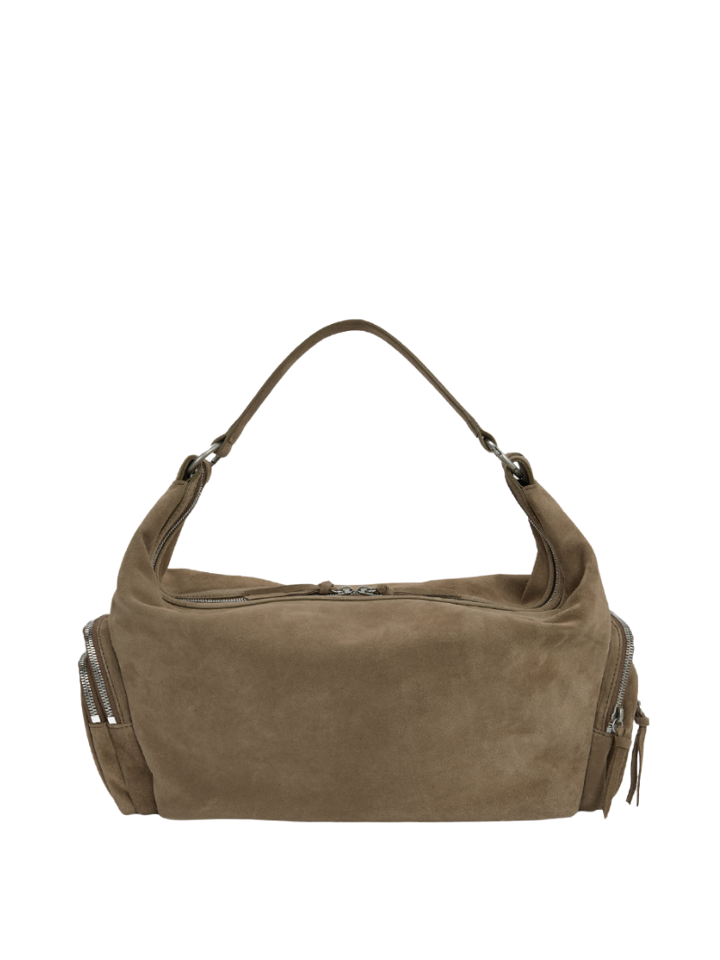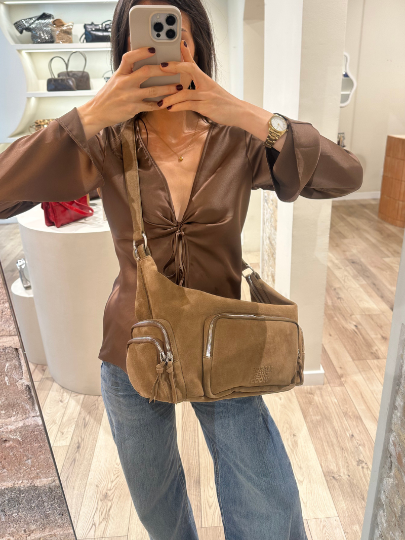 Suede hobo bag in cappuccino. This model It stands out for its structured design in soft suede, which provides a warm texture and a sophisticated feel. The suede finish offers a vintage touch and is incredibly soft to the touch.
