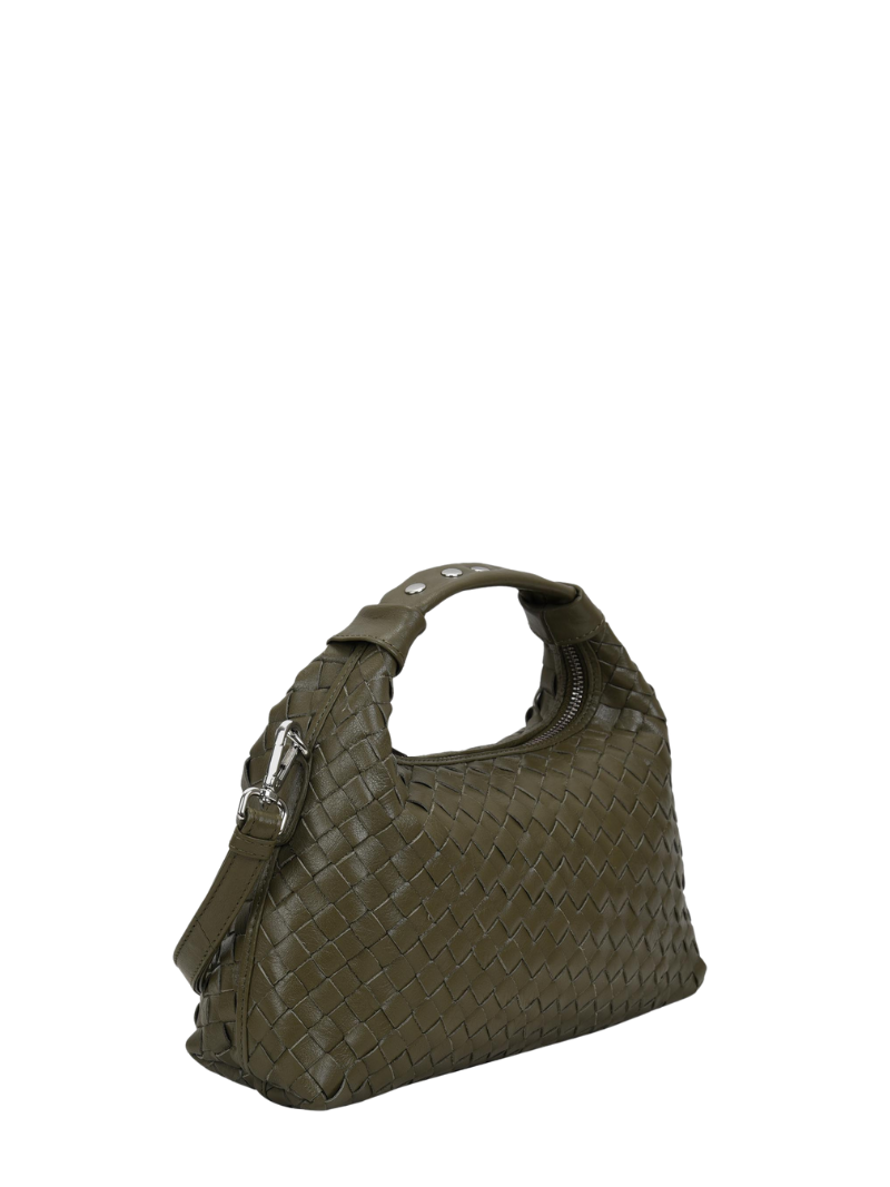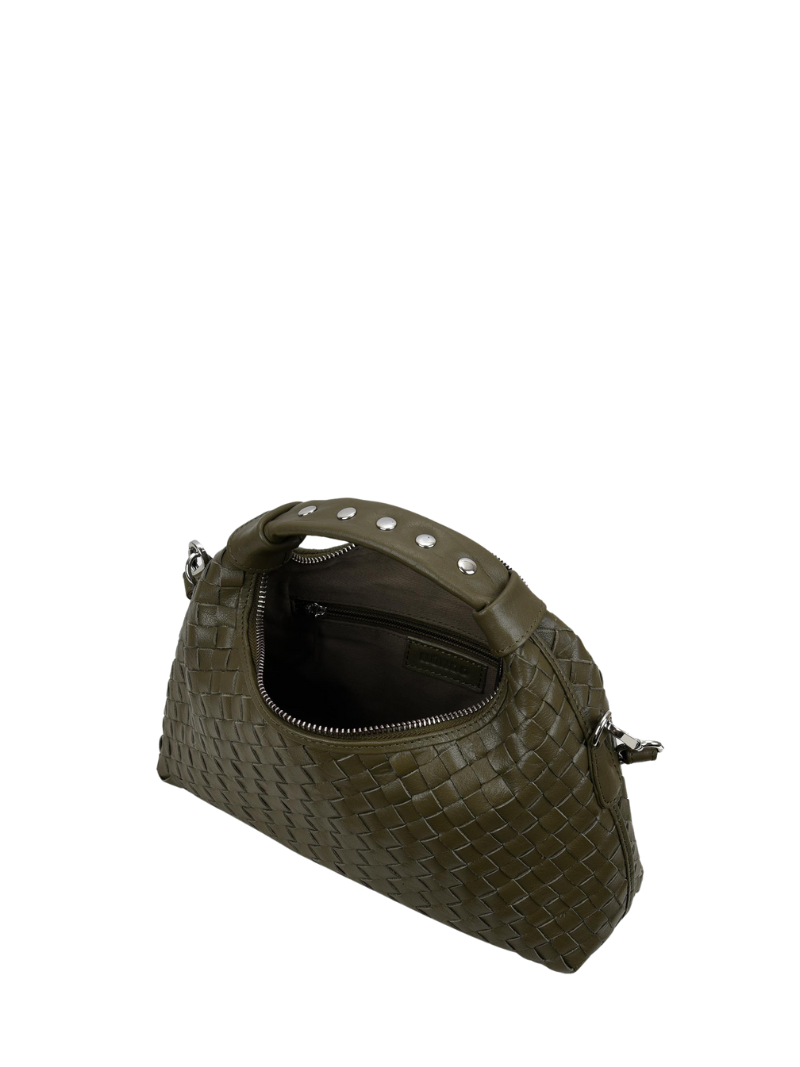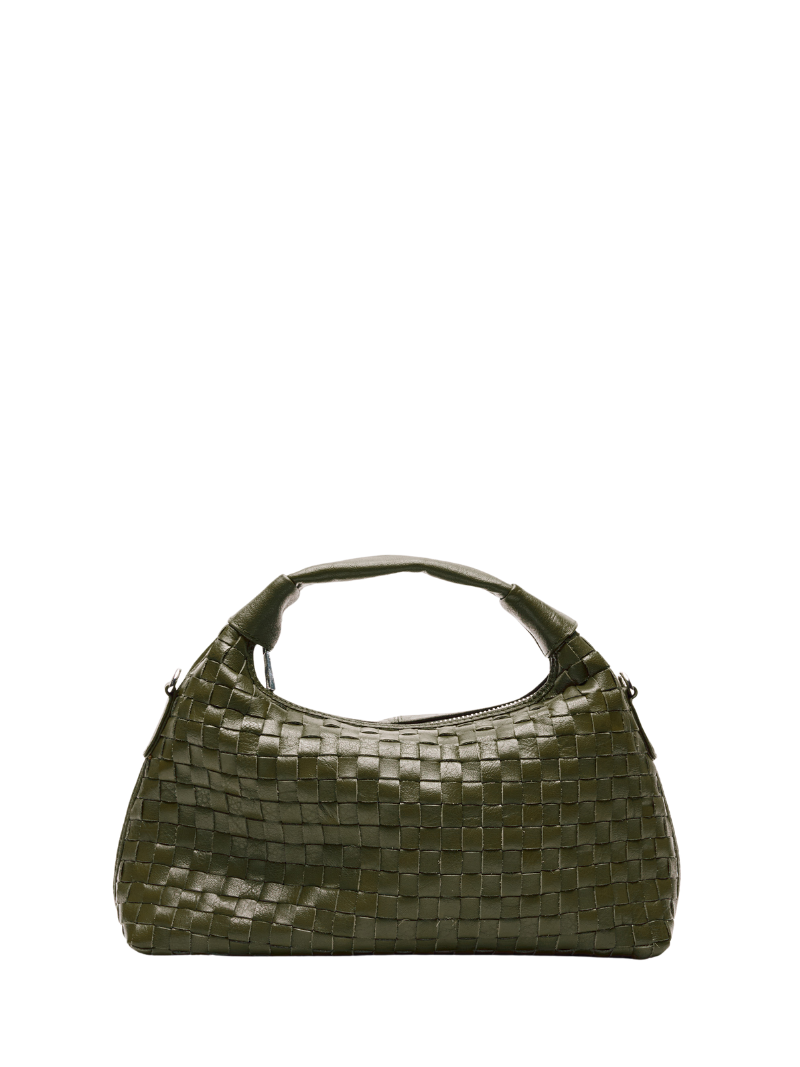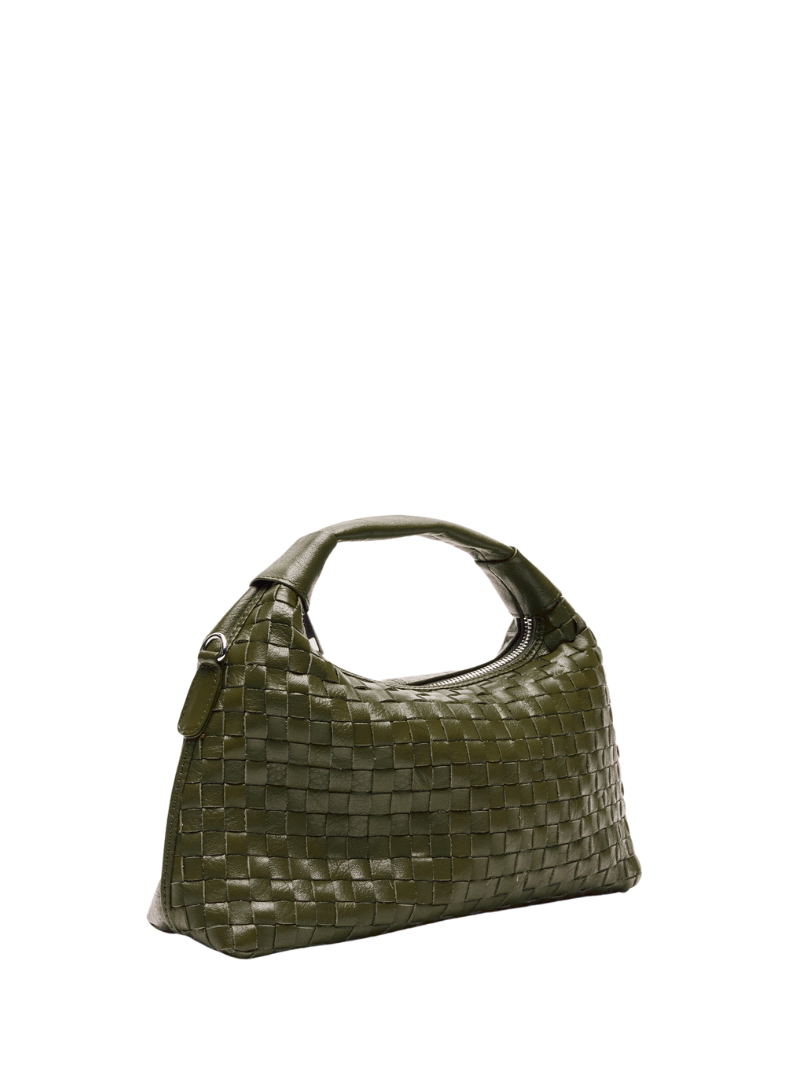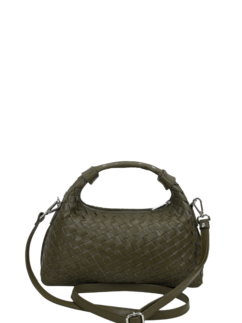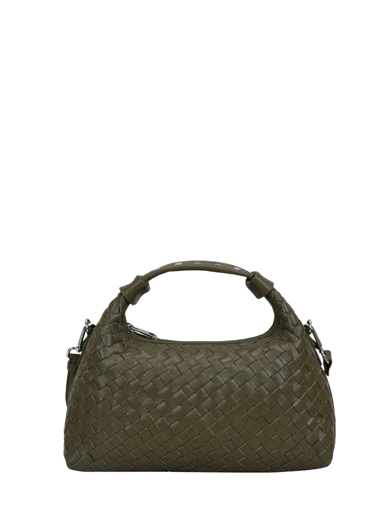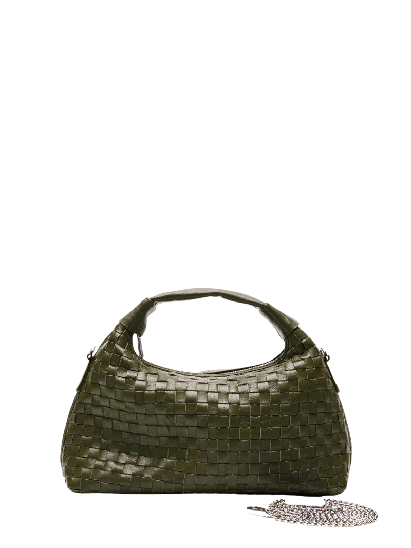 Medium handbag with a short handle and a long chain for crossbody wear. Made of 100% colored leather. Olive green with a braided design. The bag has a main compartment with a small interior pocket that closes with a zipper.