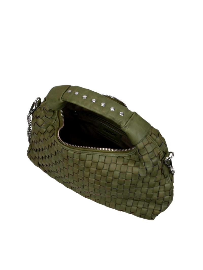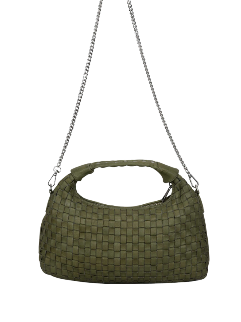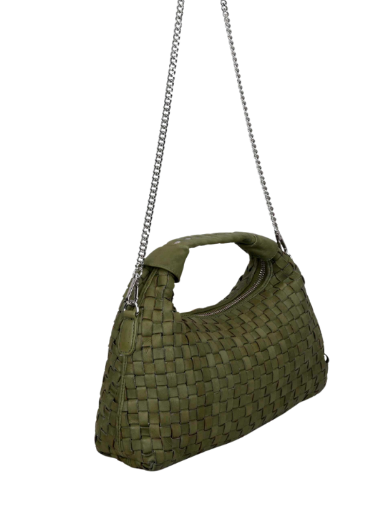 Medium military green washed leather handbag with a short handle and a long chain to carry it across the body. Made of 100% leather and with a braided design. The bag has a main compartment with a small interior pocket that closes with a zipper.