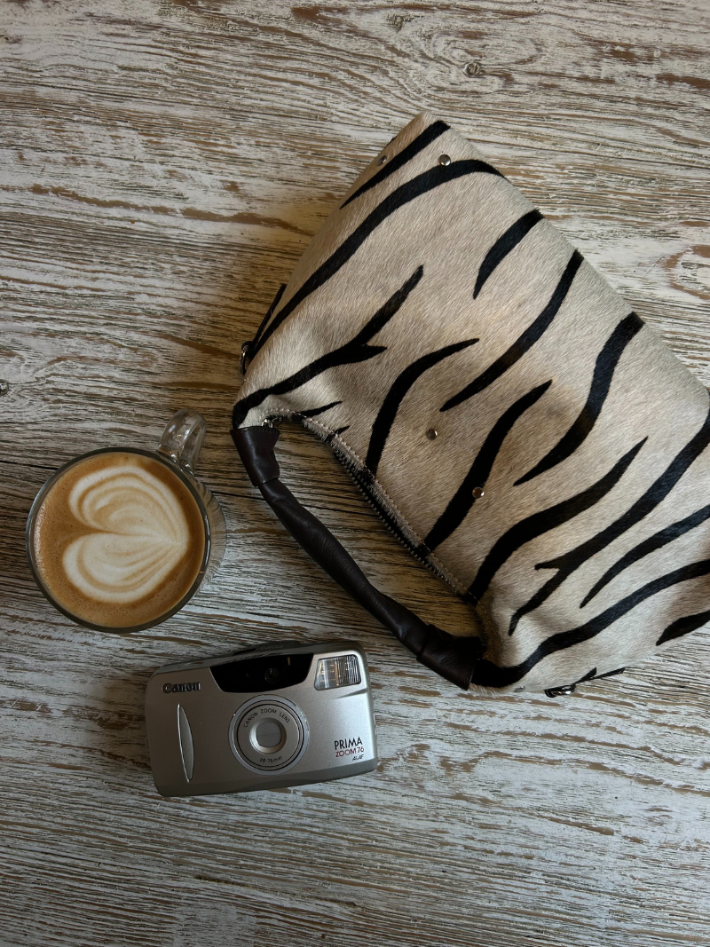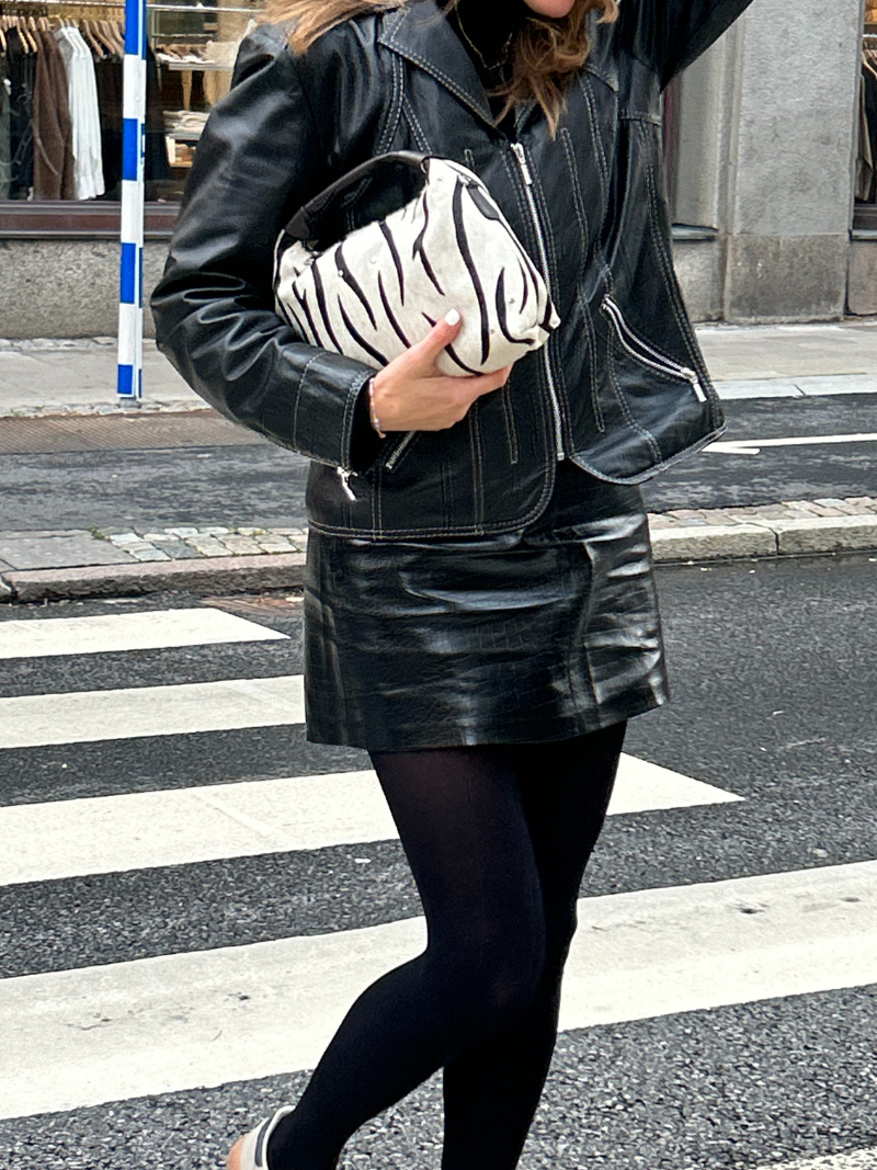 Medium, hobo-type handbag with a short handle and a long chain to carry it crossbody. Zebra-print fur, with silver zippers and studs. The bag has a main compartment with a small interior pocket that closes with a zipper.