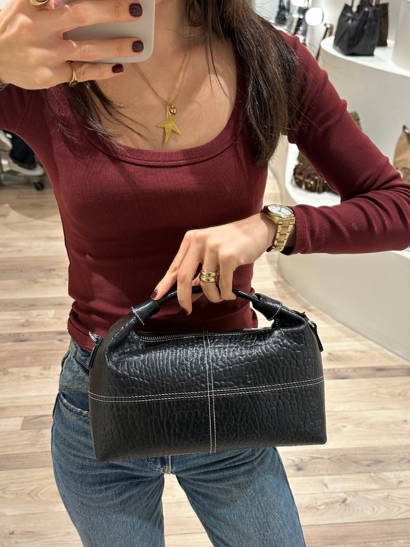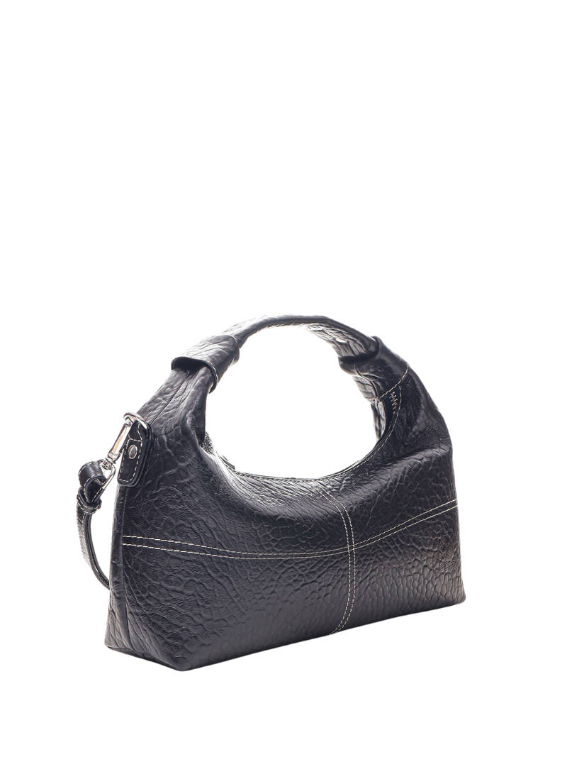 Medium handbag with a short handle and a long chain for crossbody wear. Made of 100% colored leather. Black with a textured finish and contrasting stitching. The bag has a main compartment with a small interior pocket that closes with a zipper.