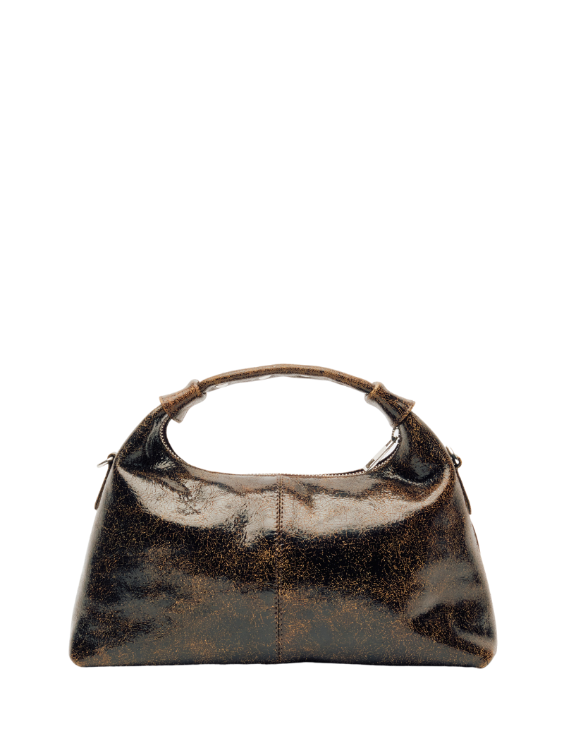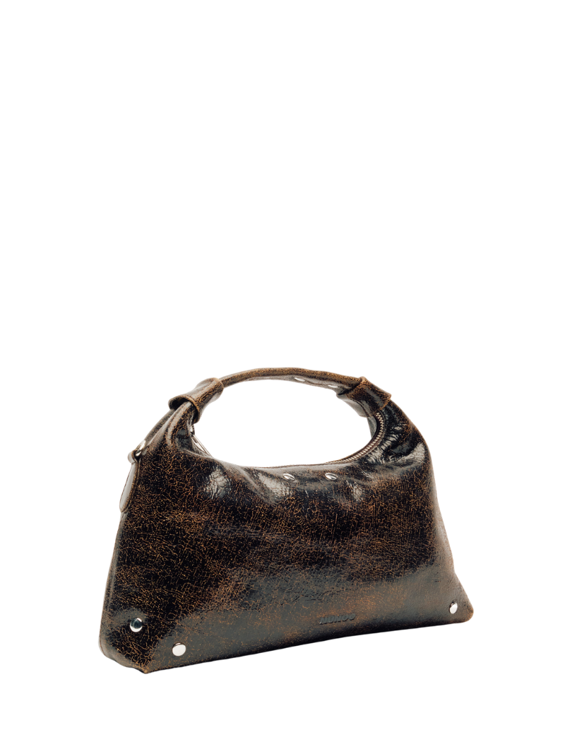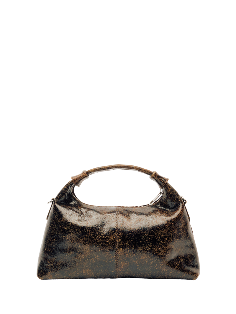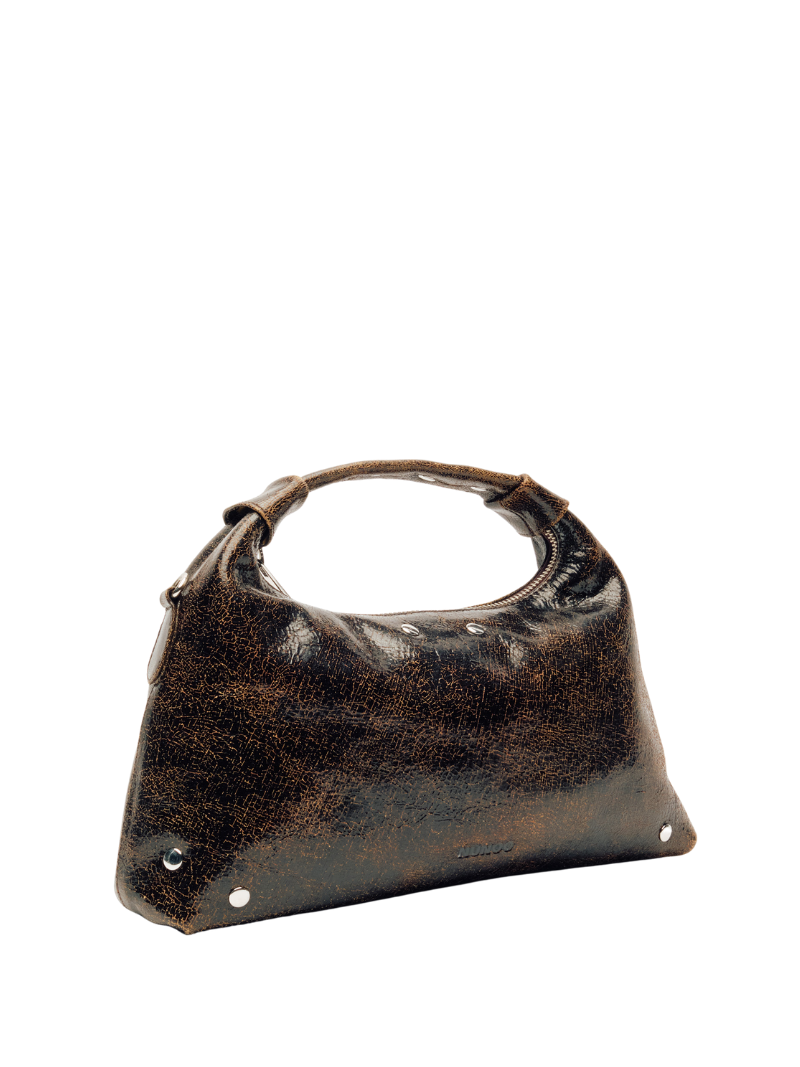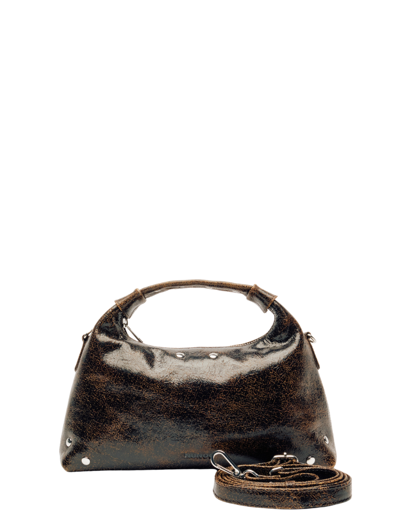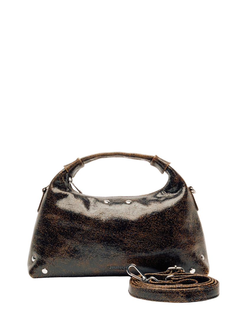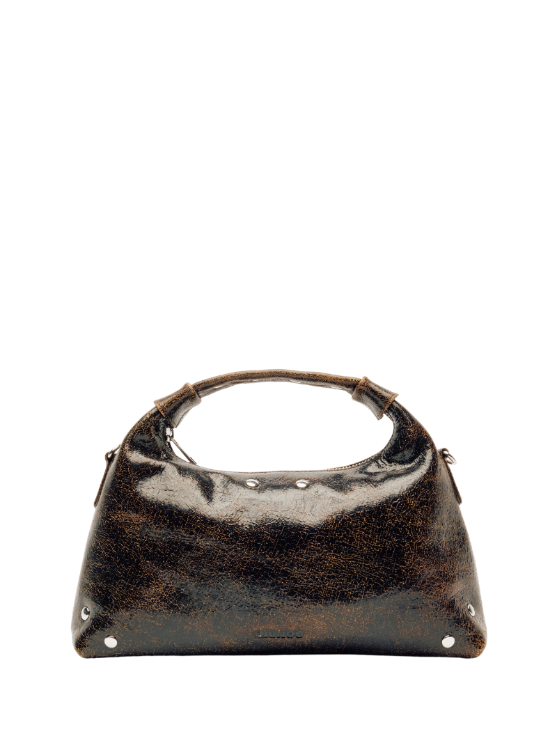 Medium-sized bag in vintage-effect black and brown leather, with a short handle for carrying by hand and a long leather chain that allows it to be worn across the body or on the shoulder.