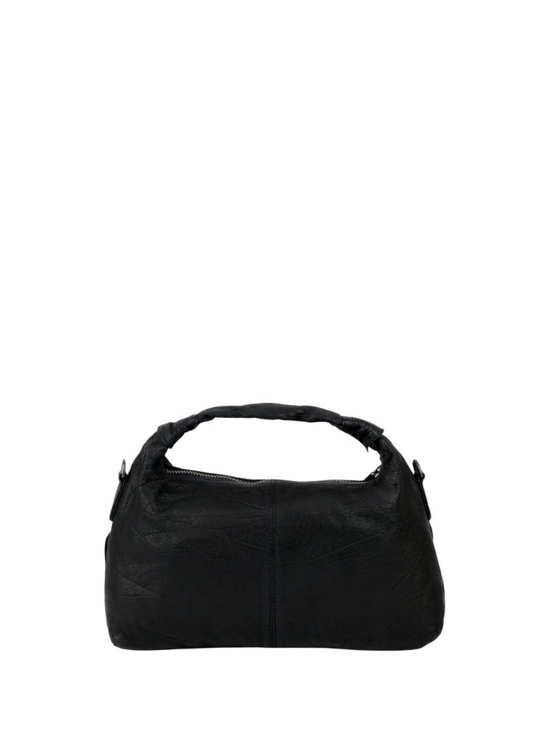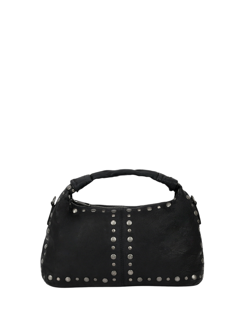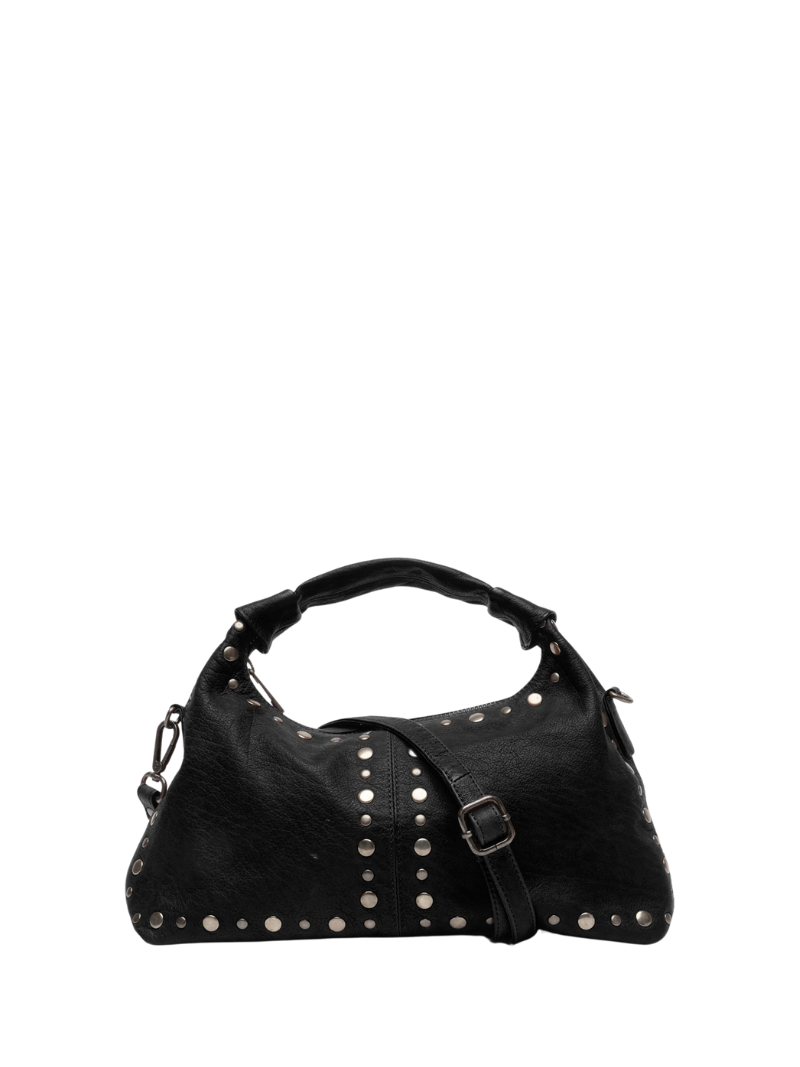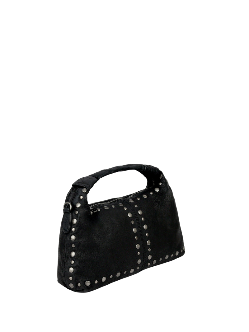 Medium black leather bag with silver studs on the front. It features a main compartment with a zipper closure and an adjustable, removable strap for crossbody or hand-carried wear.