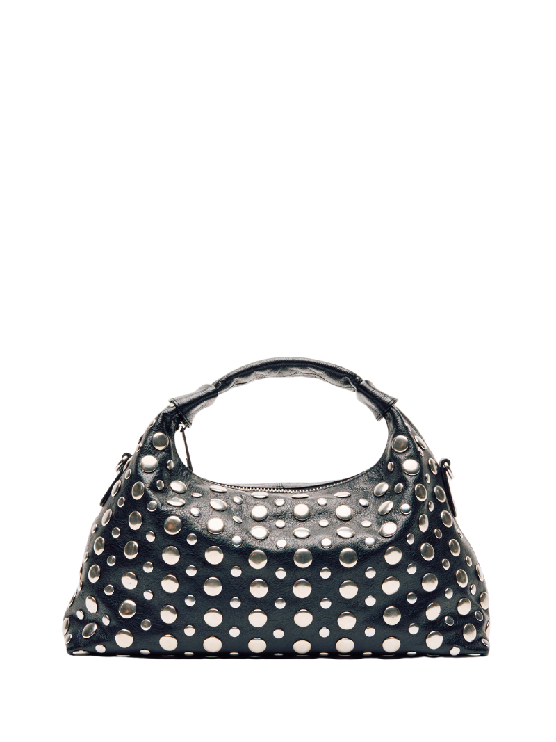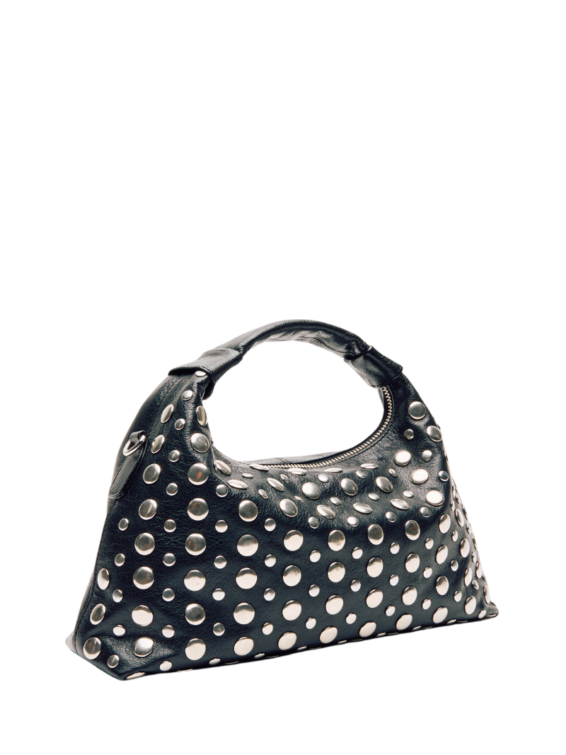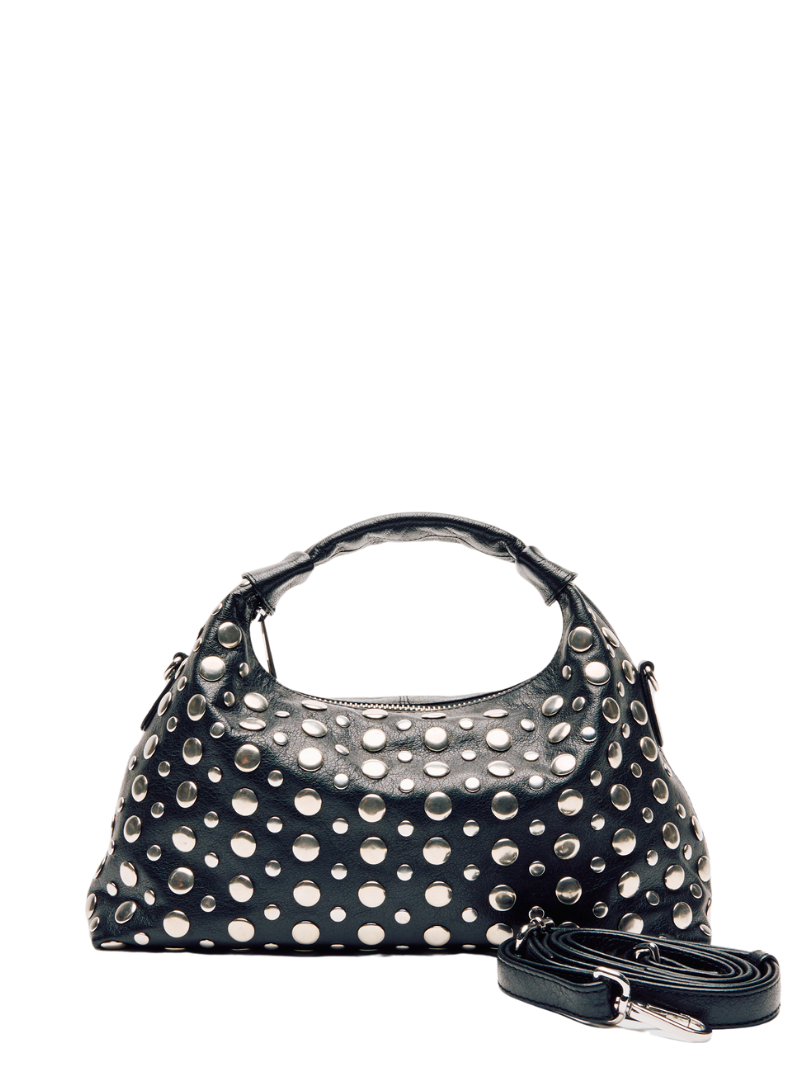 Medium black leather bag with large silver studs on the front. It features a main compartment with a zipper closure and an adjustable, removable strap for crossbody or hand-carried wear.