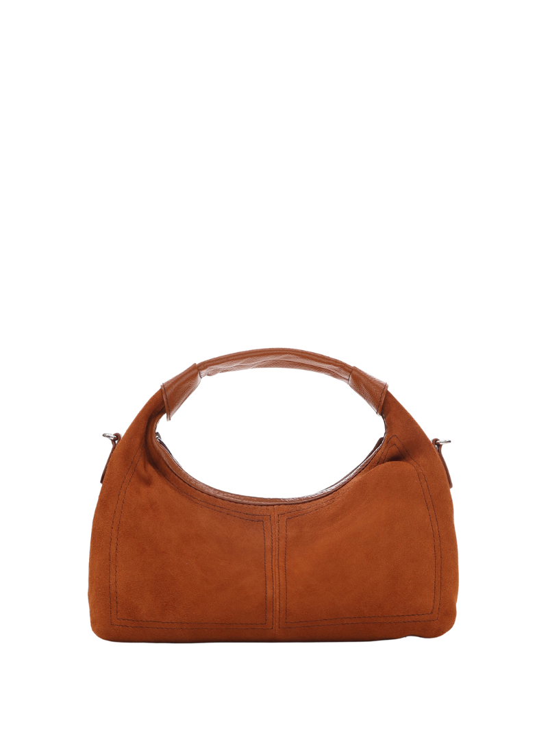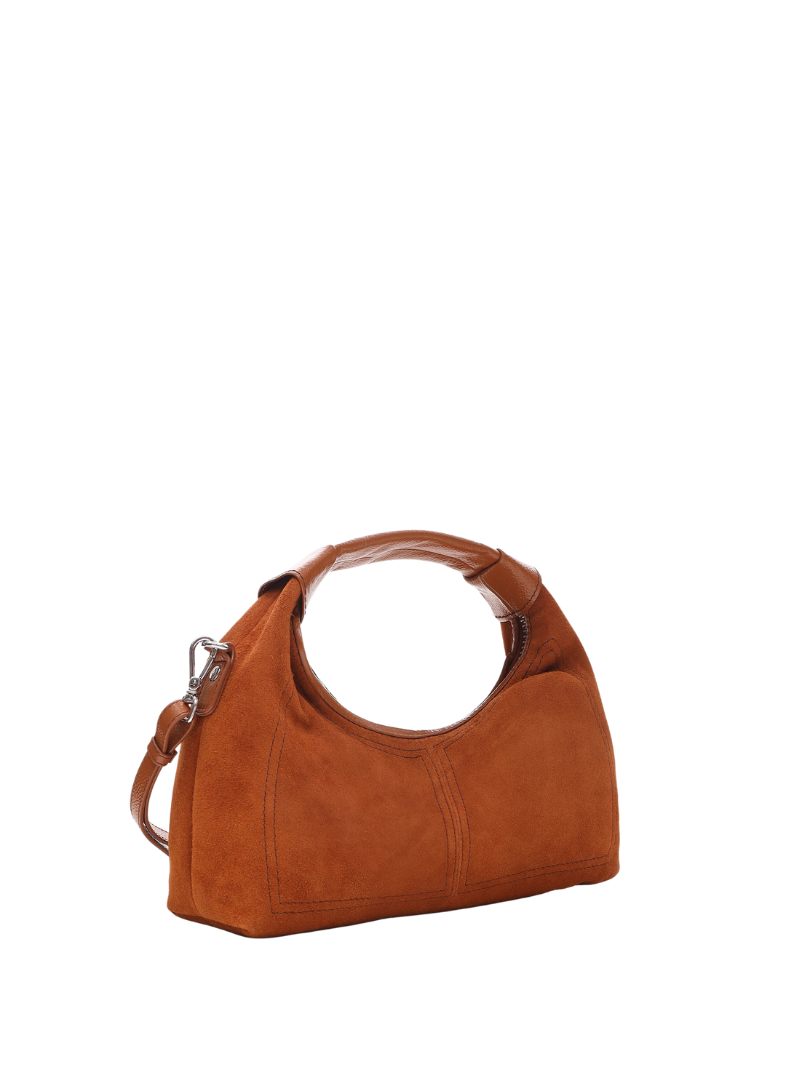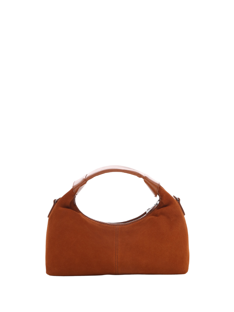 Medium-sized brown suede bag with a short handle for carrying by hand and a long chain for carrying across the body or on the shoulder.