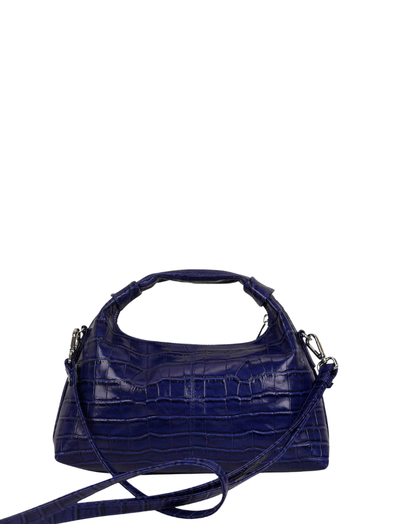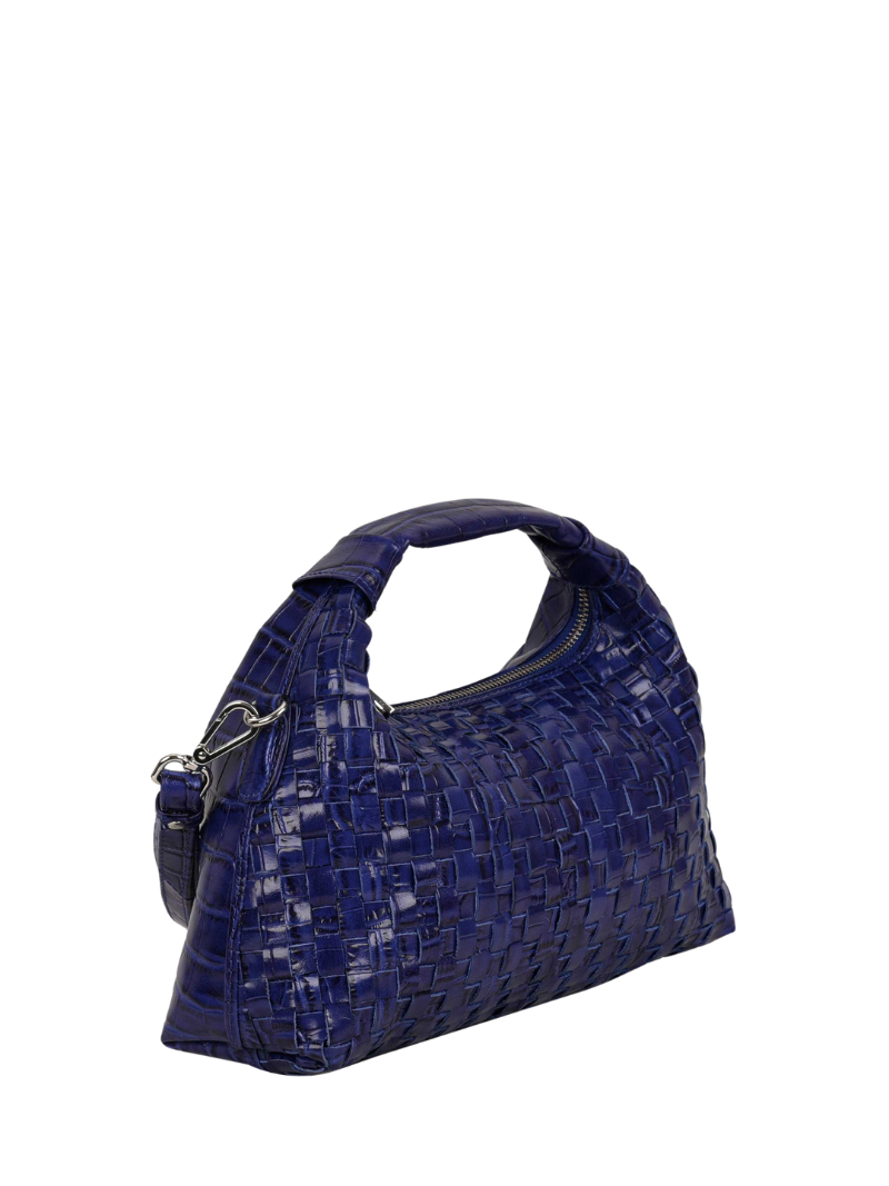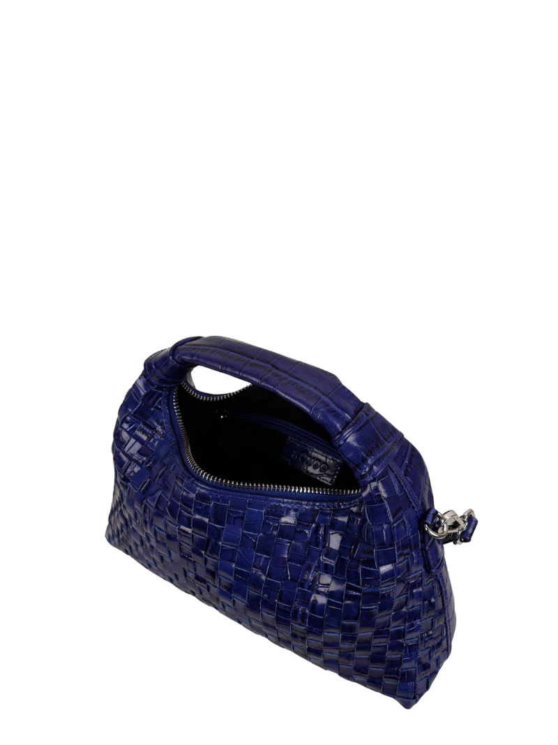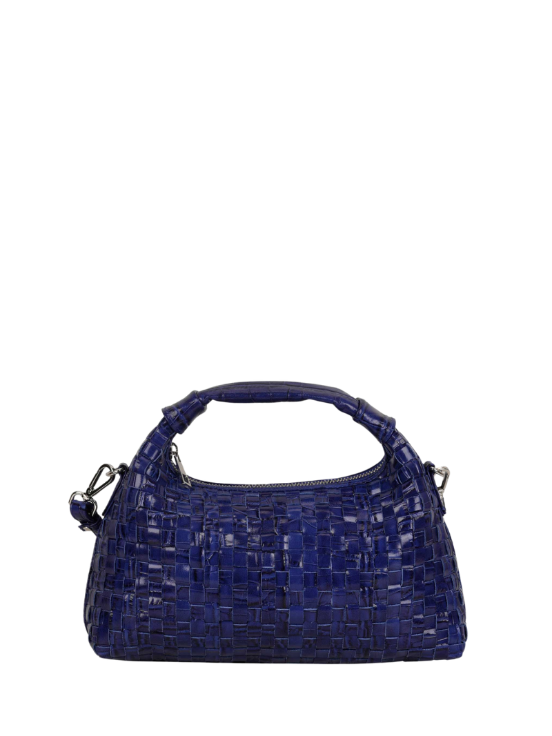 Medium dark blue leather bag. With a short handle for carrying by hand and a long strap for carrying across the body. Made of 100% leather and featuring a braided design. The bag has a main compartment with a small interior pocket that closes with a zipper.