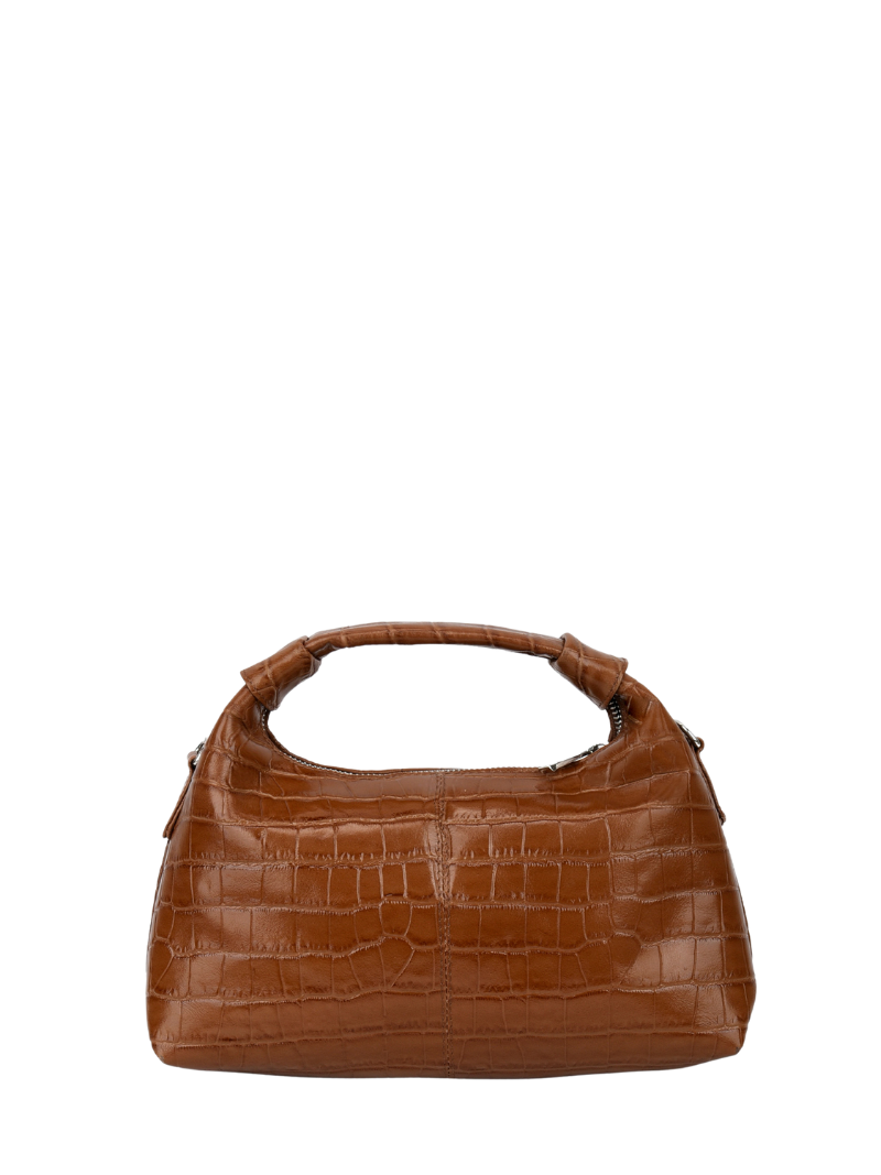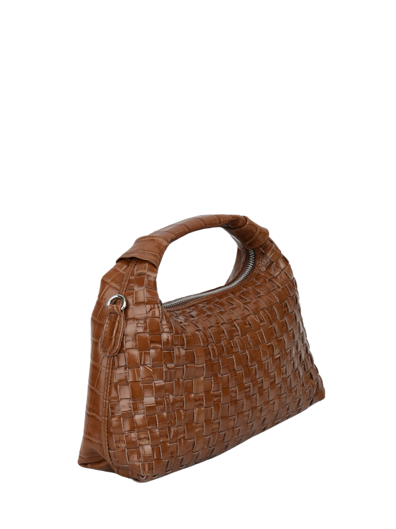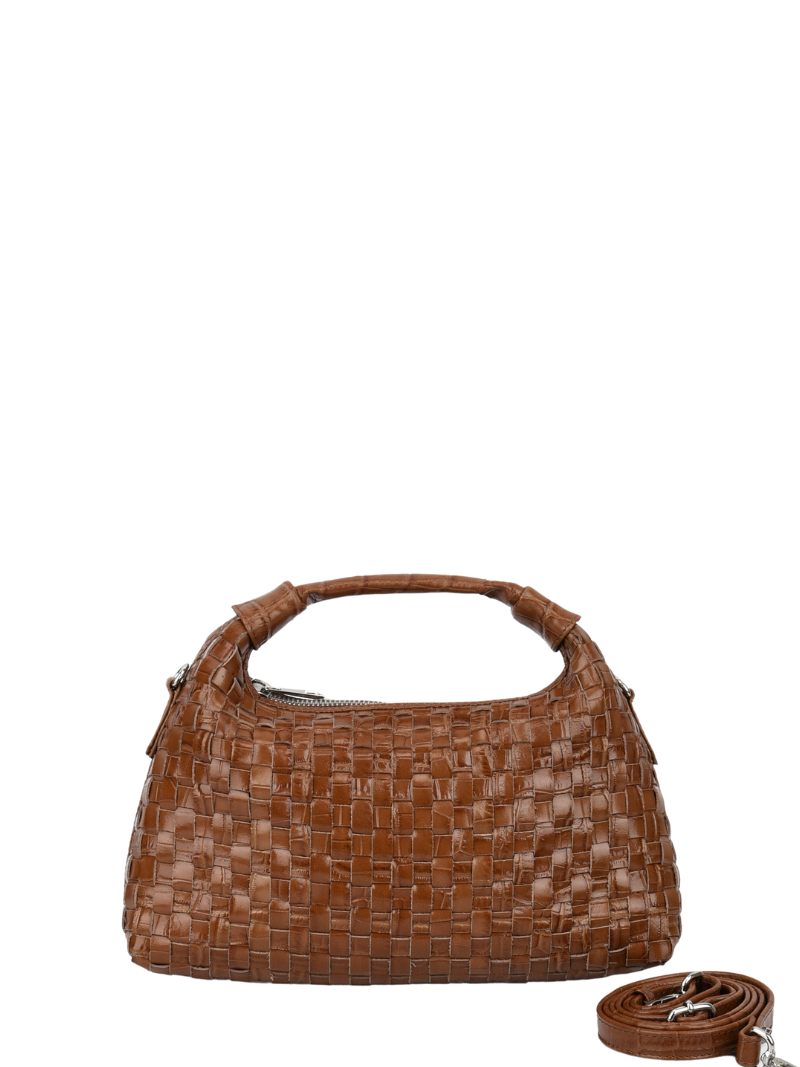 Medium brown leather bag. With a short handle for carrying by hand and a long strap for carrying across the body. Made of 100% leather and featuring a braided design. The bag has a main compartment with a small interior pocket that closes with a zipper.