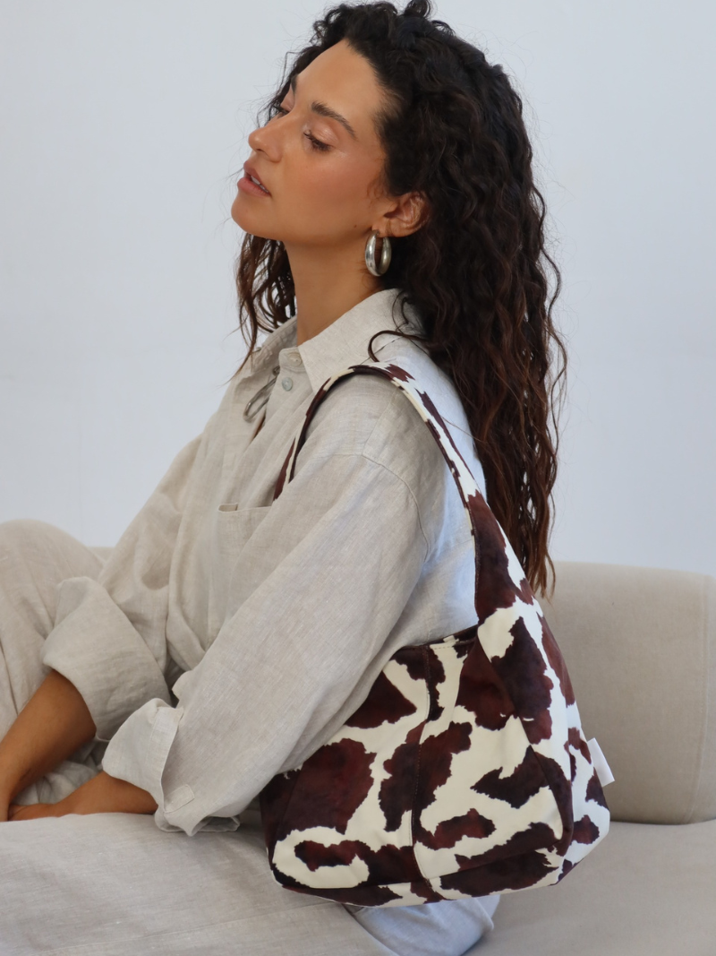 Medium cow print shoulder bag that combines originality, style, and functionality in a single accessory. Its size is perfect for carrying throughout the day without being bulky, yet still has enough space to carry the essentials: wallet, phone, keys, makeup, and more.