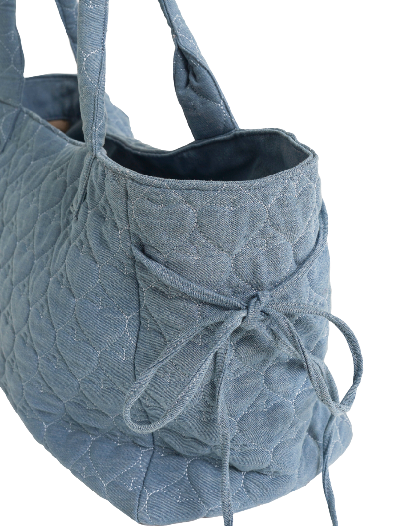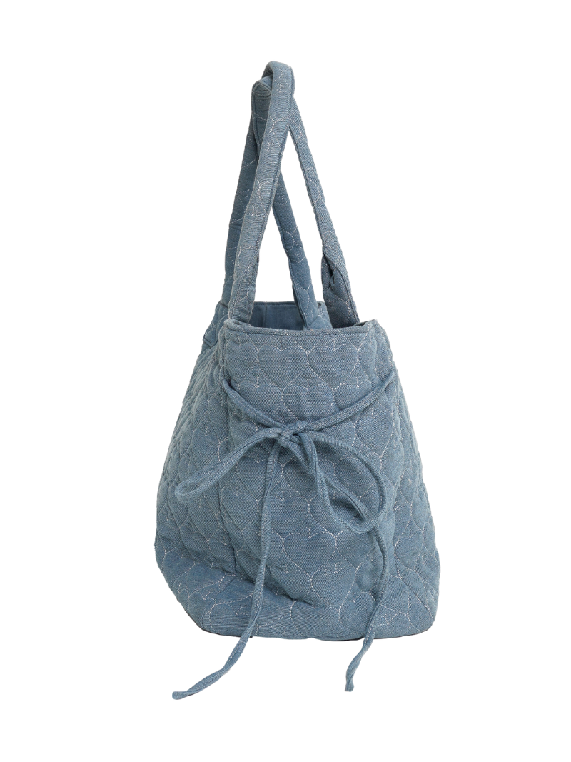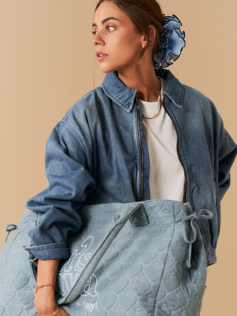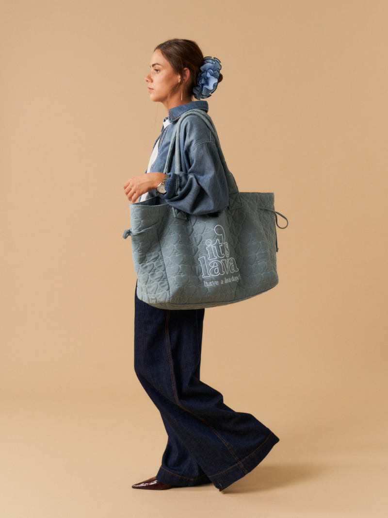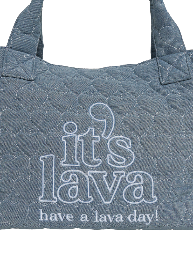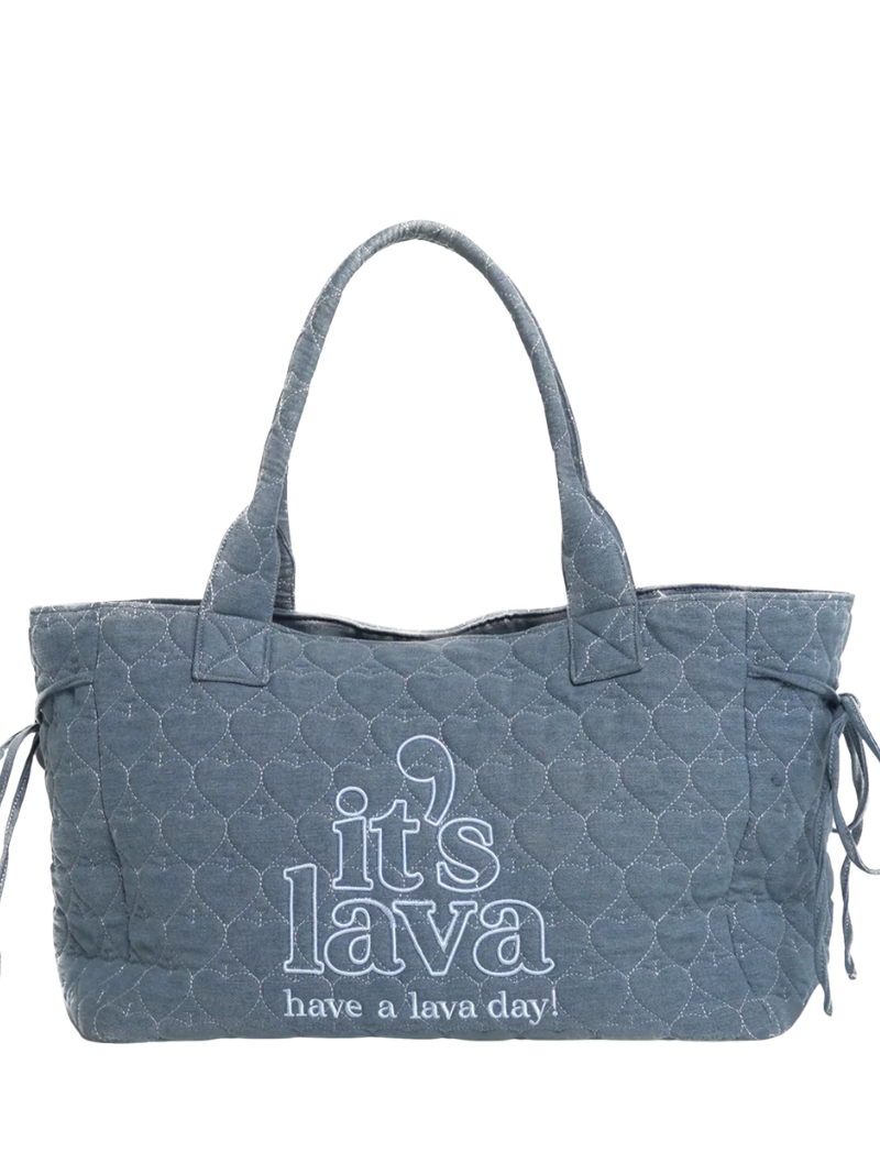 All-terrain shopper bag in denim fabric with hearts and the It's Lava logo embroidered on it. The bag closes completely with a zip, has an interior pocket, and two ties on each side to adjust the size.