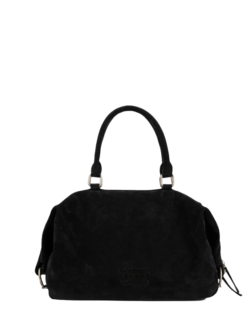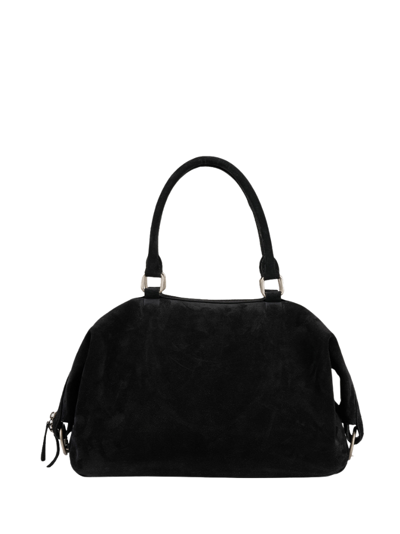 Margesherwood black suede bag with double handles. This bag is made of suede. soft black and combines elegance with functionality. Its structured design features a double top handle and a long, adjustable, removable strap, allowing it to be worn over the shoulder or across the body, depending on the occasion.