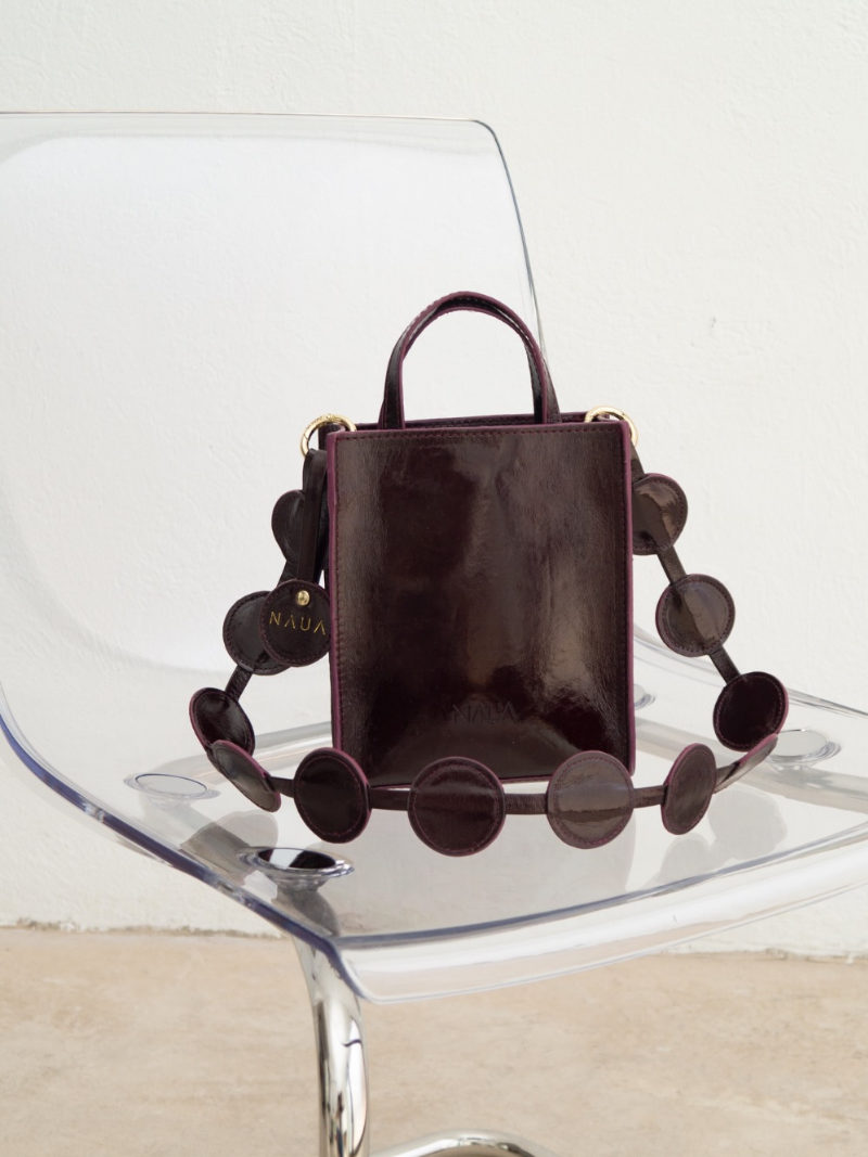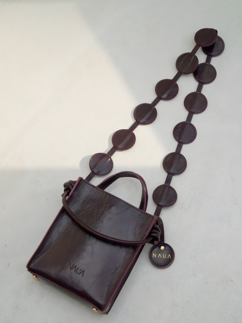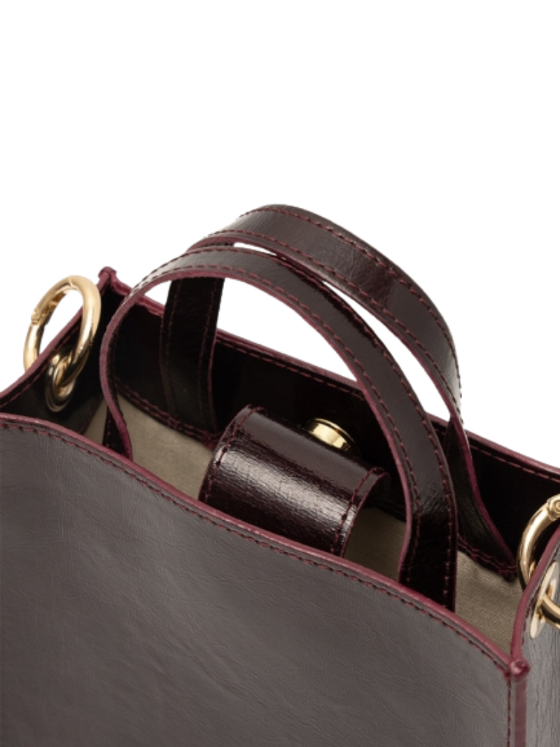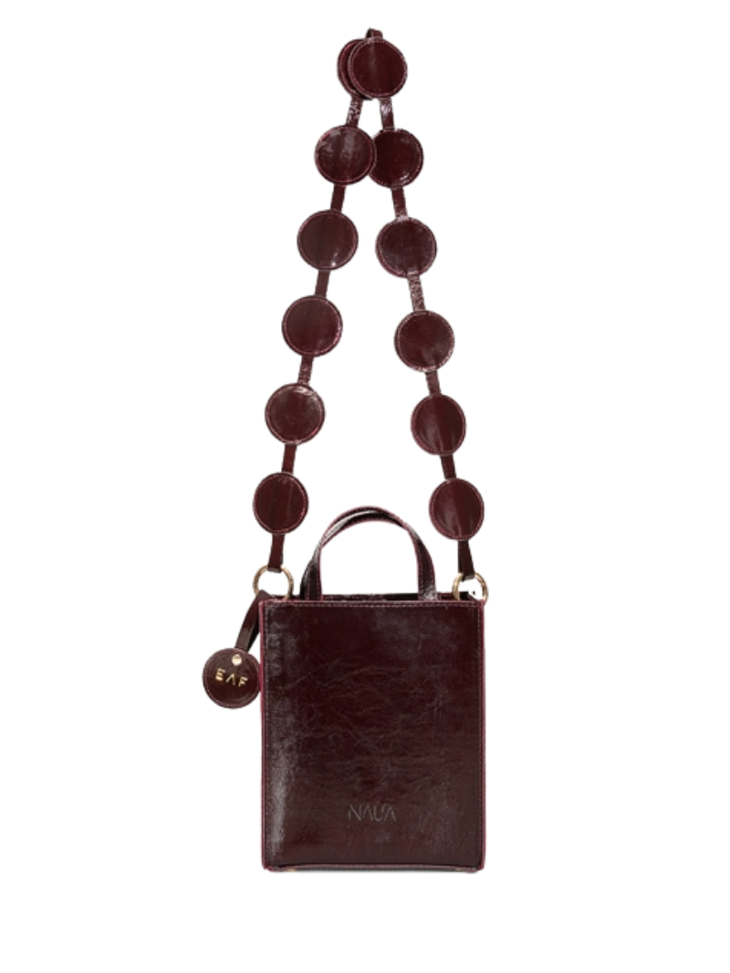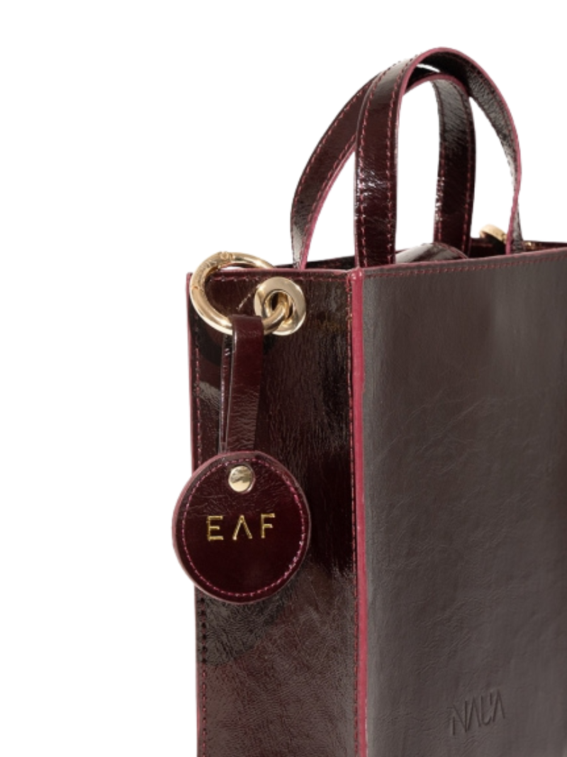 Structured crossbody bag with a circular handle, handcrafted from burgundy vegan leather. 100% made in Spain in artisan workshops.