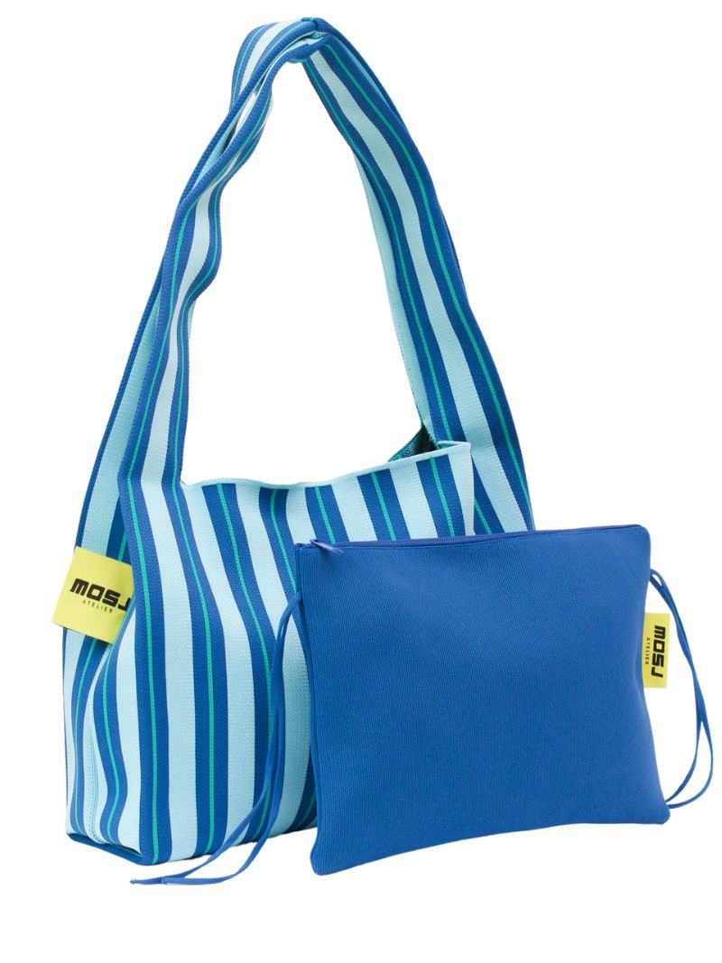 Large crossbody bag with striped print in Deep blue, light blue, and green. Made of a stretchy, durable, and highly durable material, this bag is lightweight, comfortable to carry, and easy to wash, ideal for everyday use.