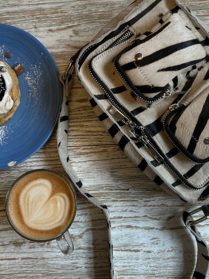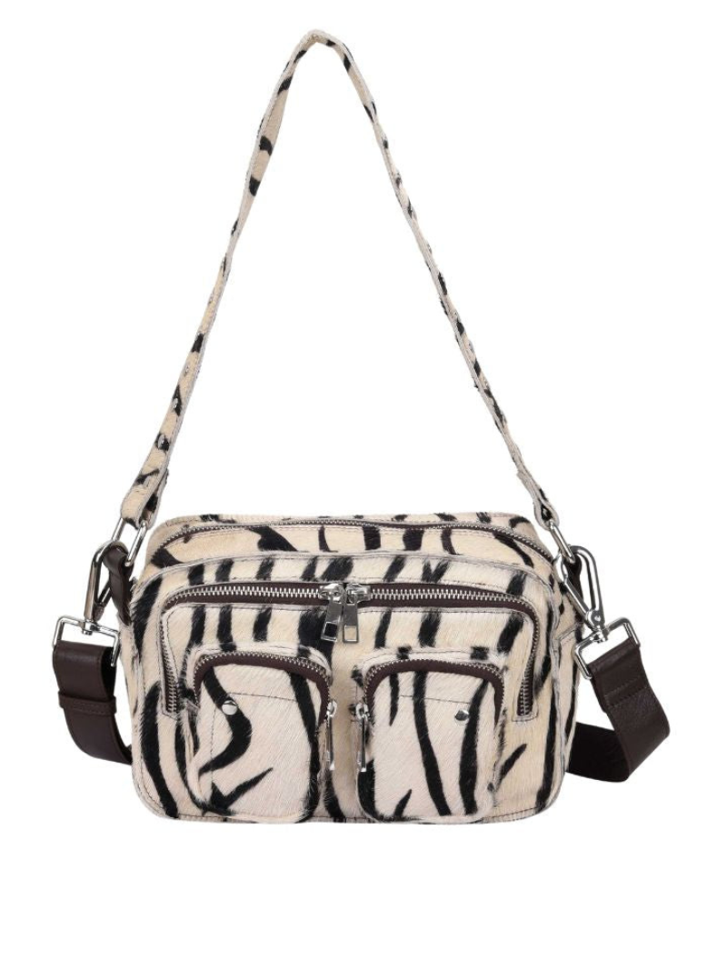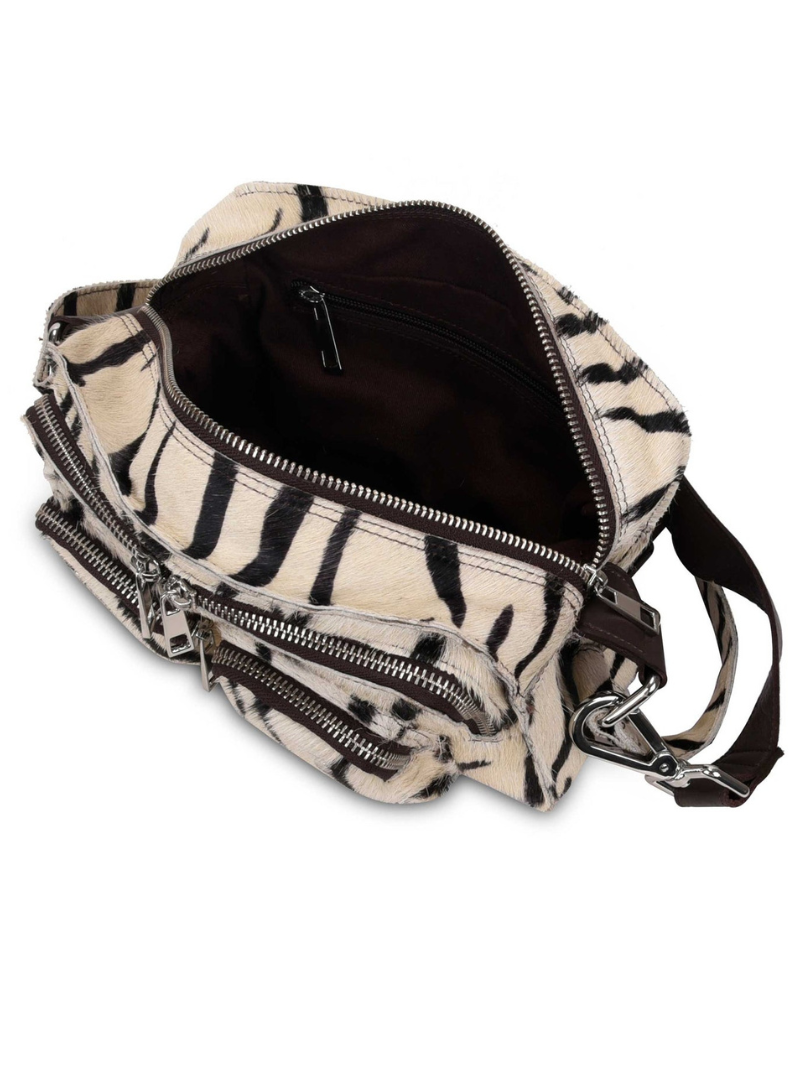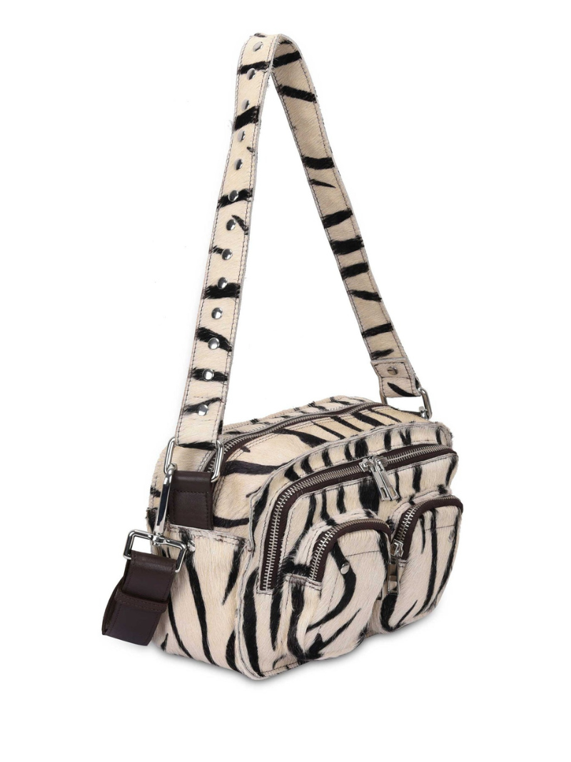 Zebra-print fur bag with silver zippers and studs. A medium-sized bag perfect for your everyday life. Made of high-quality, durable leather.