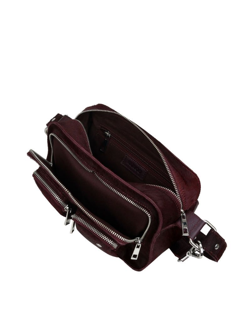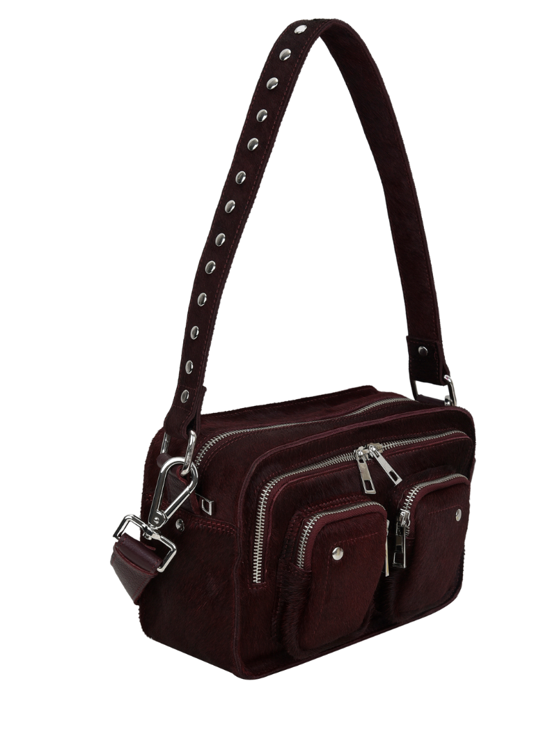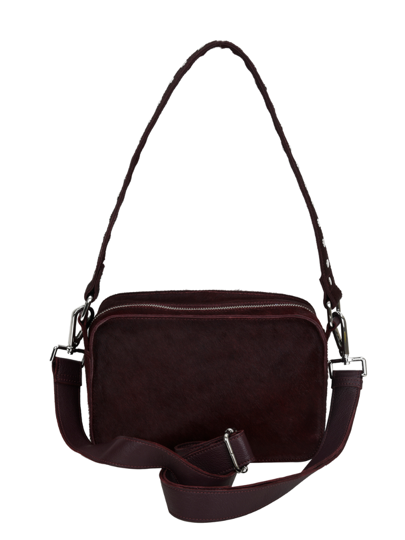 Medium burgundy leather bag with silver zippers and circular studs. A perfect medium-sized bag for your everyday life.