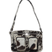 It features two front pockets, perfect for storing your most used everyday items and quickly finding them. It fits a small water bottle, your phone, a tablet, keys, a wallet, lip gloss, and more. It features a long, adjustable and removable strap that matches the bag, and a short, studded strap for carrying over the shoulder.