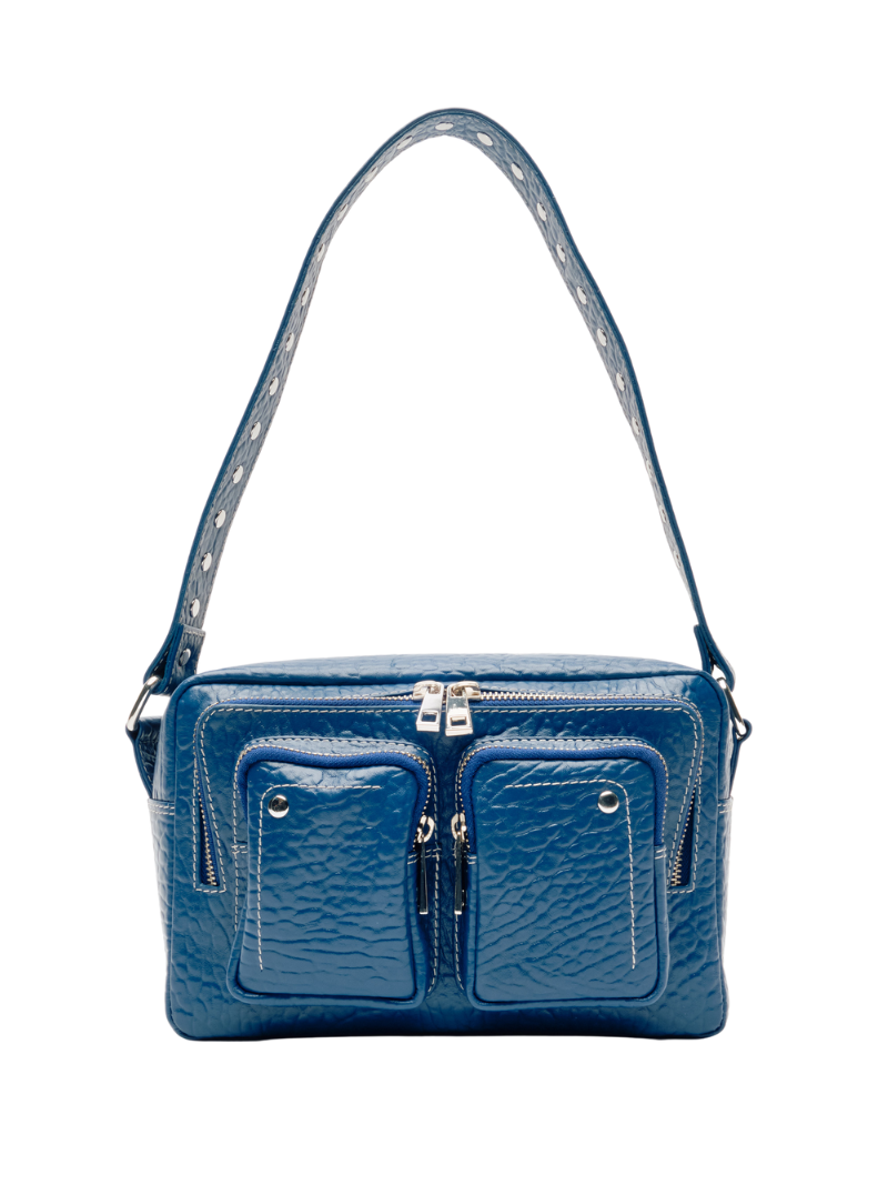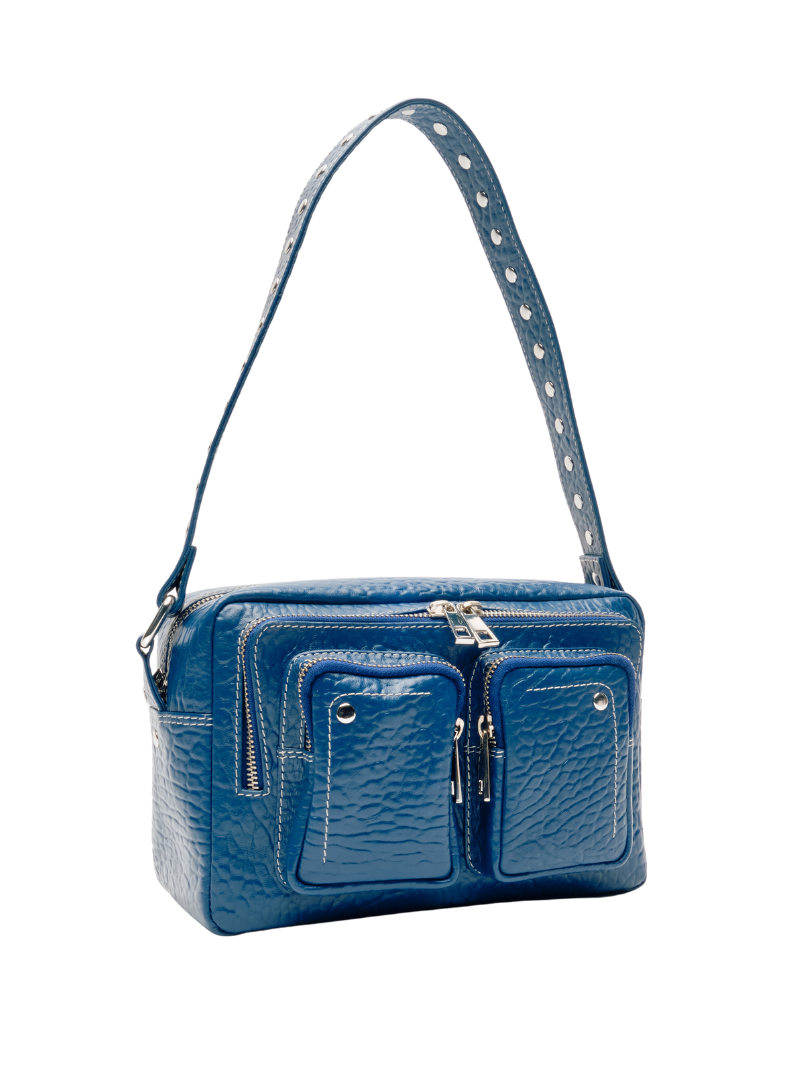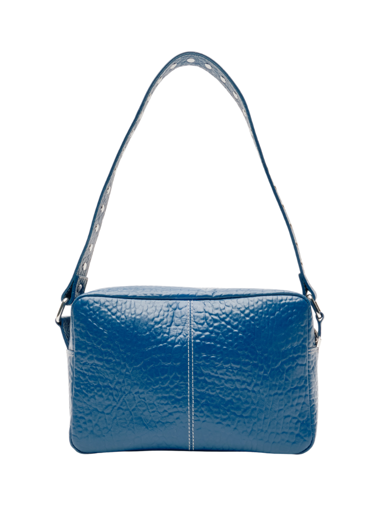 Medium blue leather bag with silver circular zippers and studs. A perfect medium-sized bag for your everyday life.
