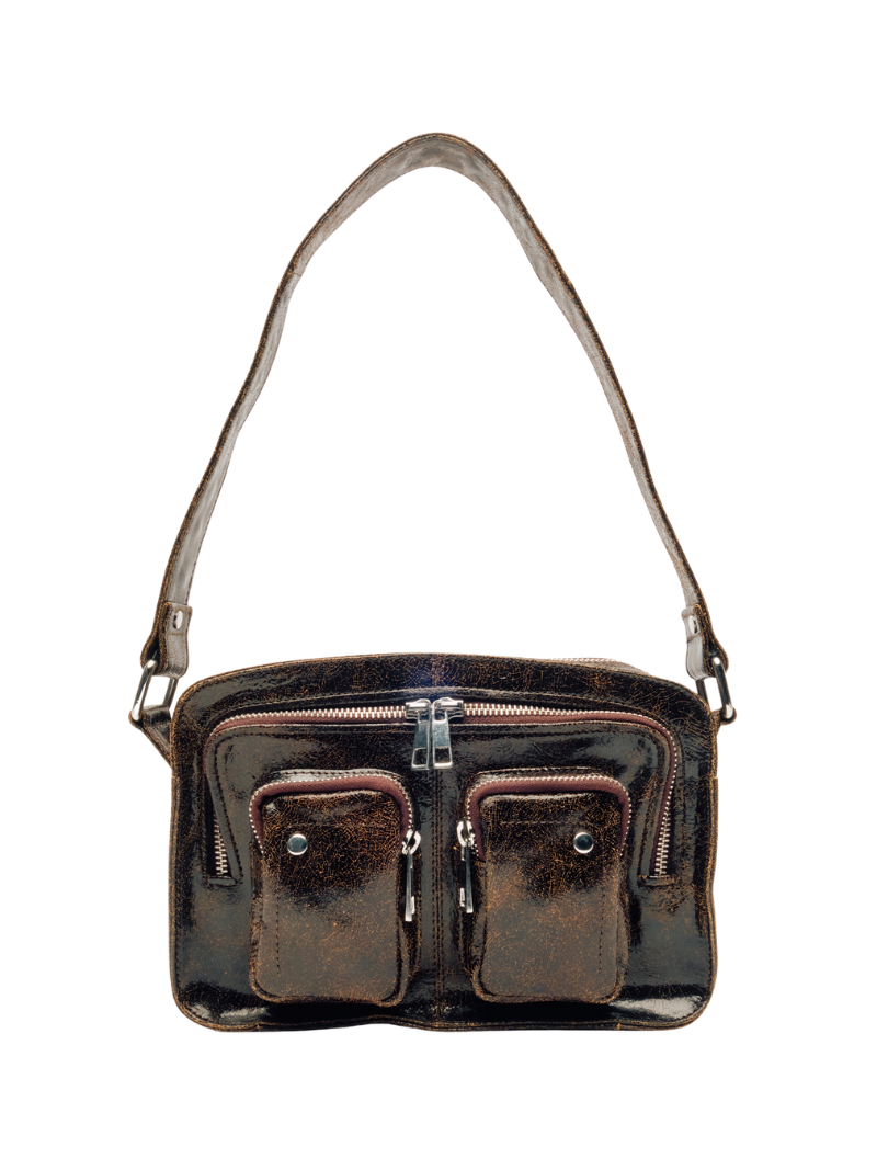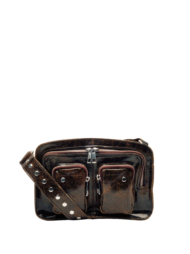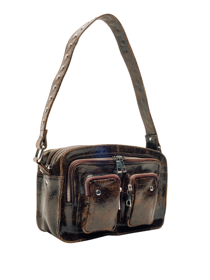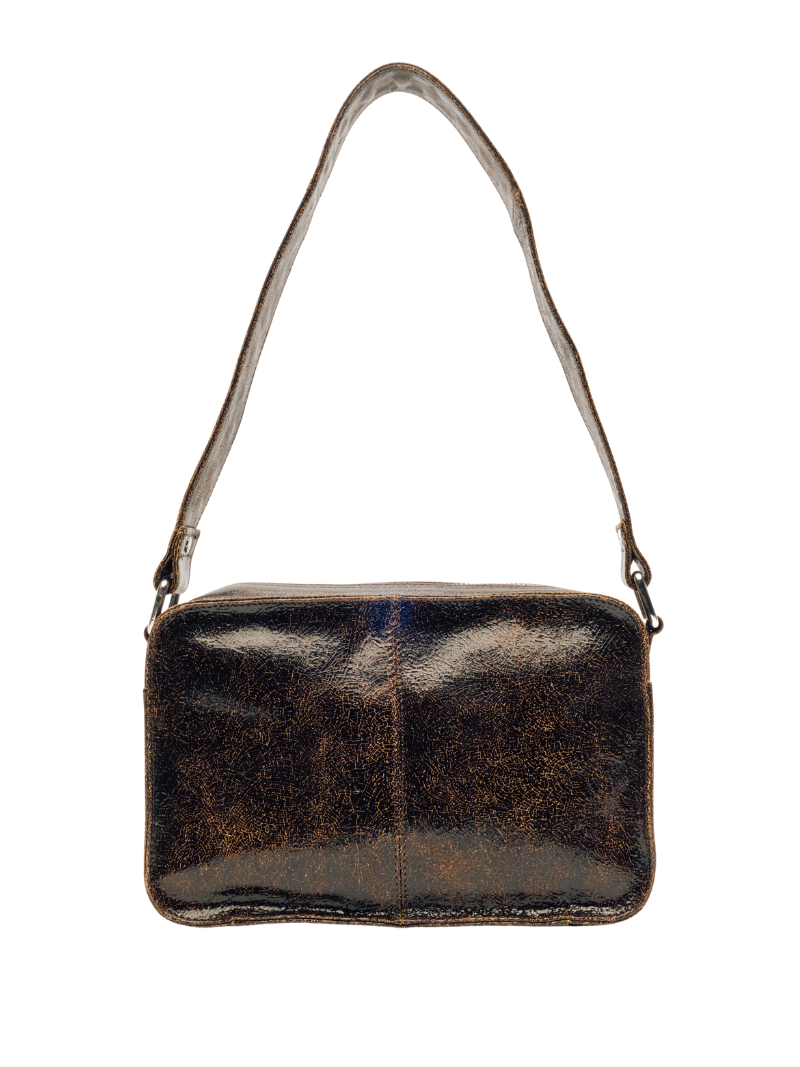 Medium-sized bag in distressed black leather with brown details, silver zippers and circular studs. A perfect medium-sized bag for your everyday life.