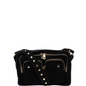 It features two front pockets, perfect for storing your everyday essentials and finding them quickly. It can hold a small water bottle, your phone, a tablet, keys, a wallet, lip gloss, and much more. It also includes a long, adjustable, and removable strap that matches the bag, and a short studded shoulder strap.