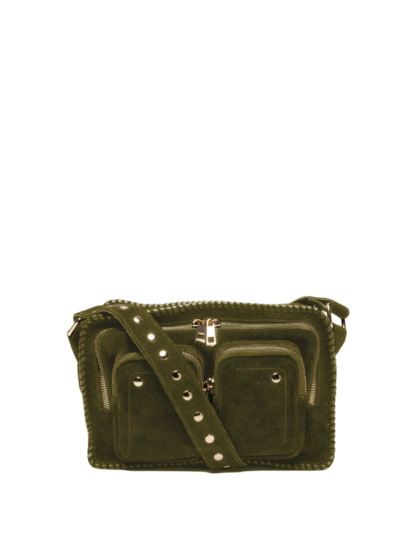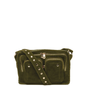 Medium-sized green suede handbag with gold zippers and studs in a circular pattern. A perfect medium-sized bag for everyday use.