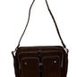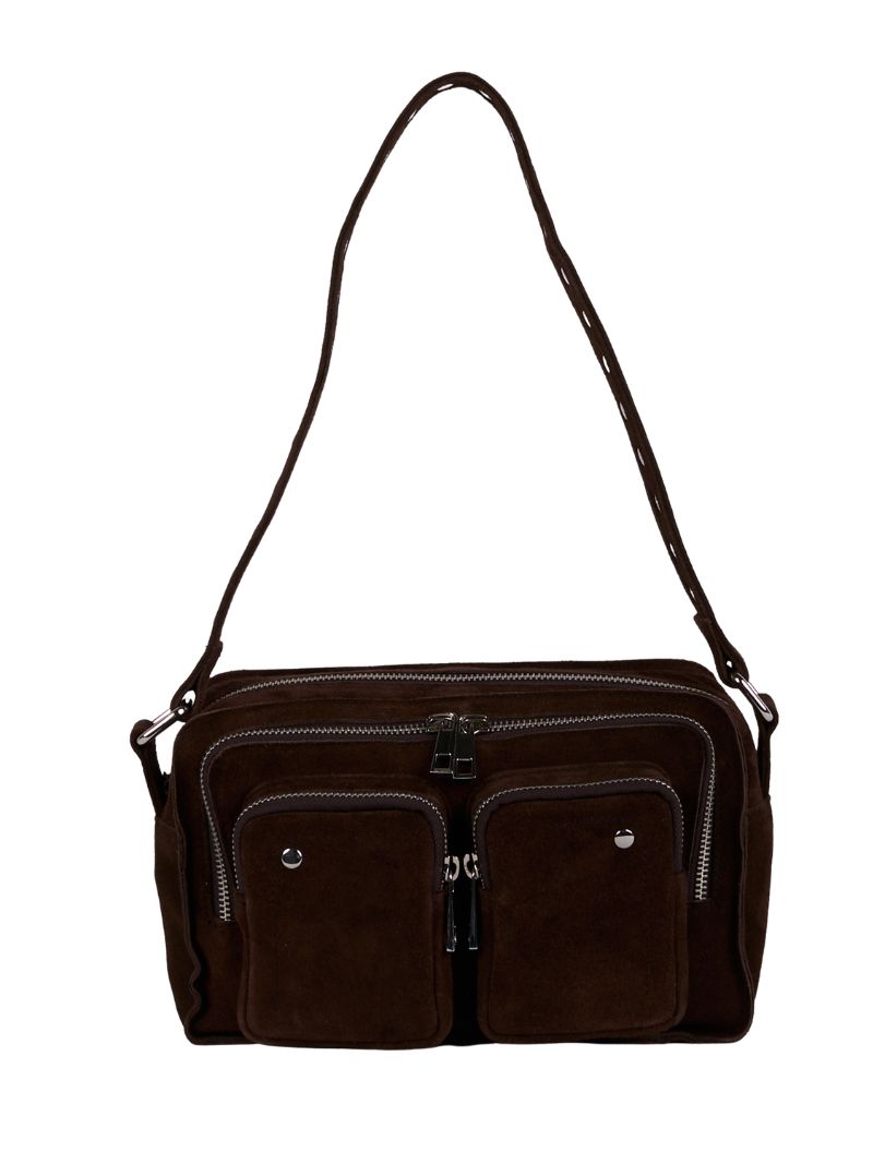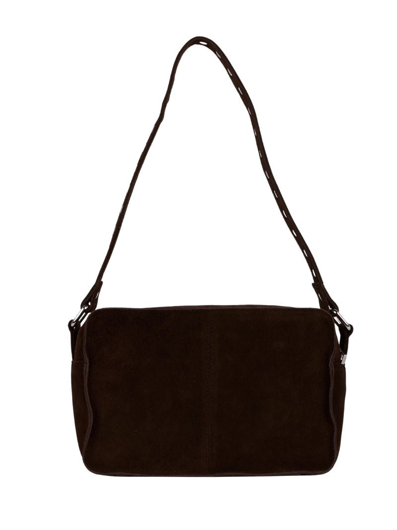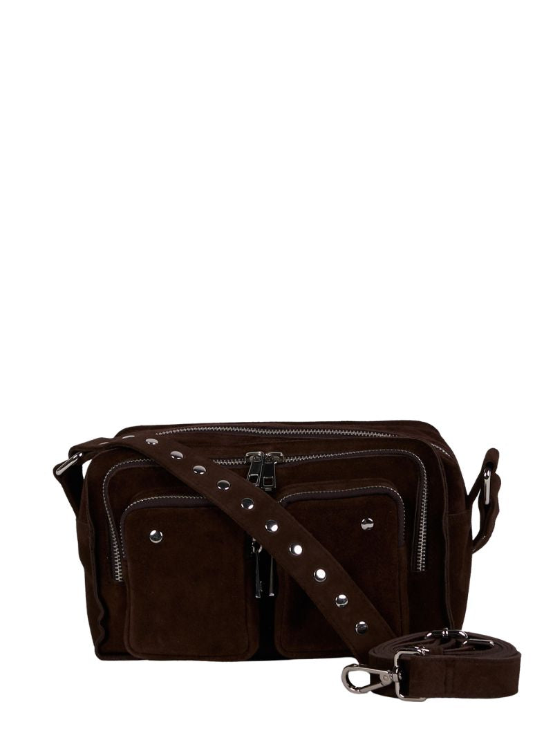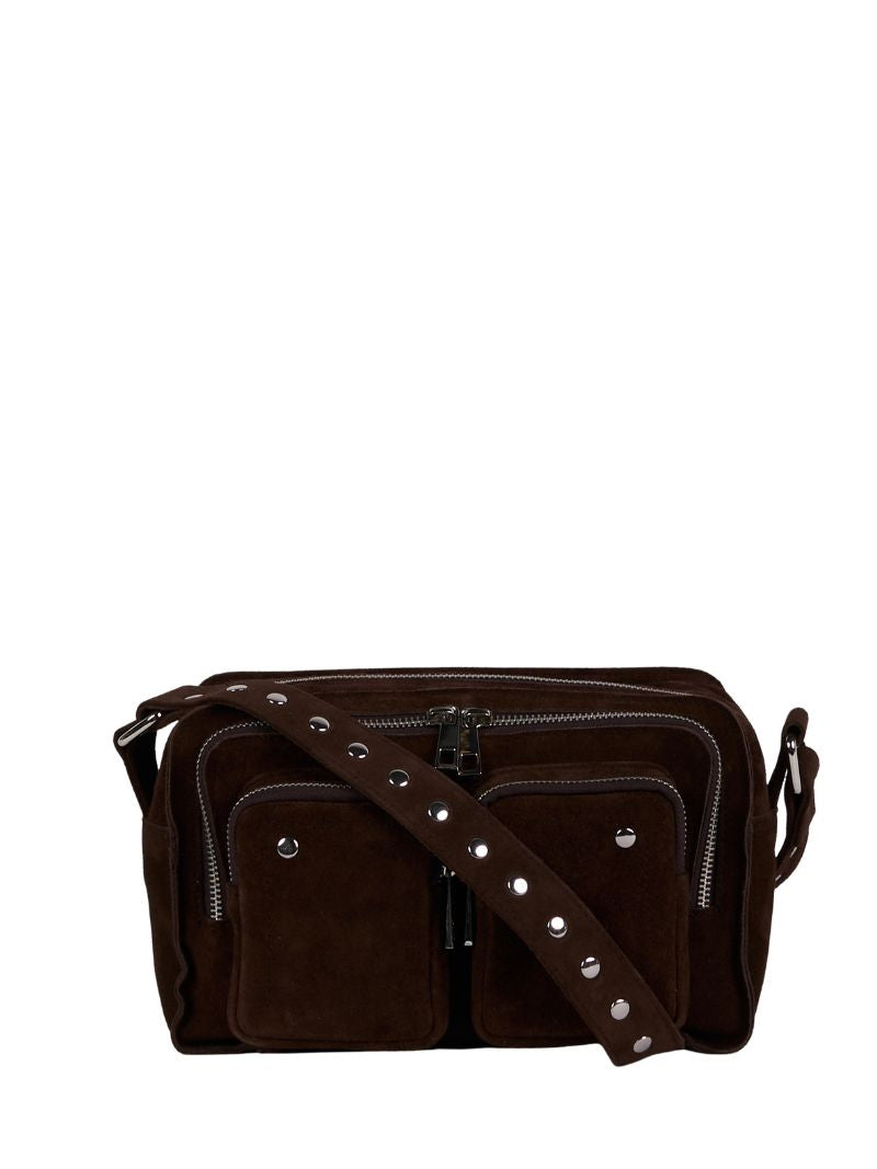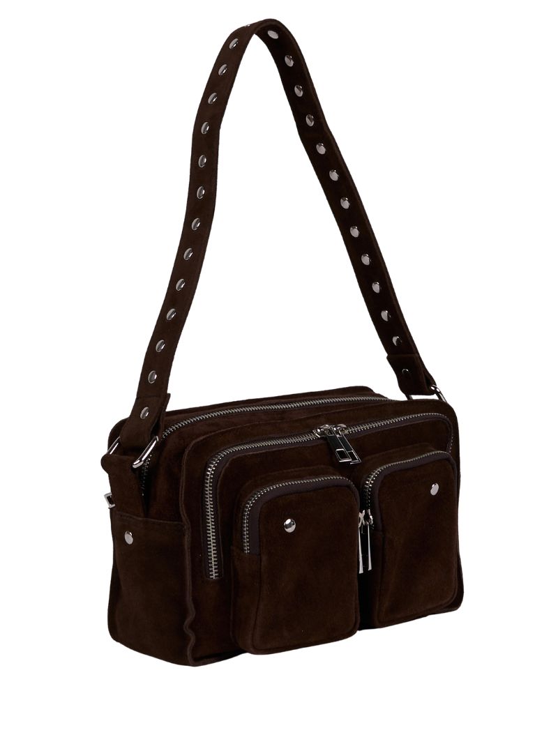Medium-sized chocolate brown suede bag with circular zippers and studs. A perfect medium-sized bag for everyday use.