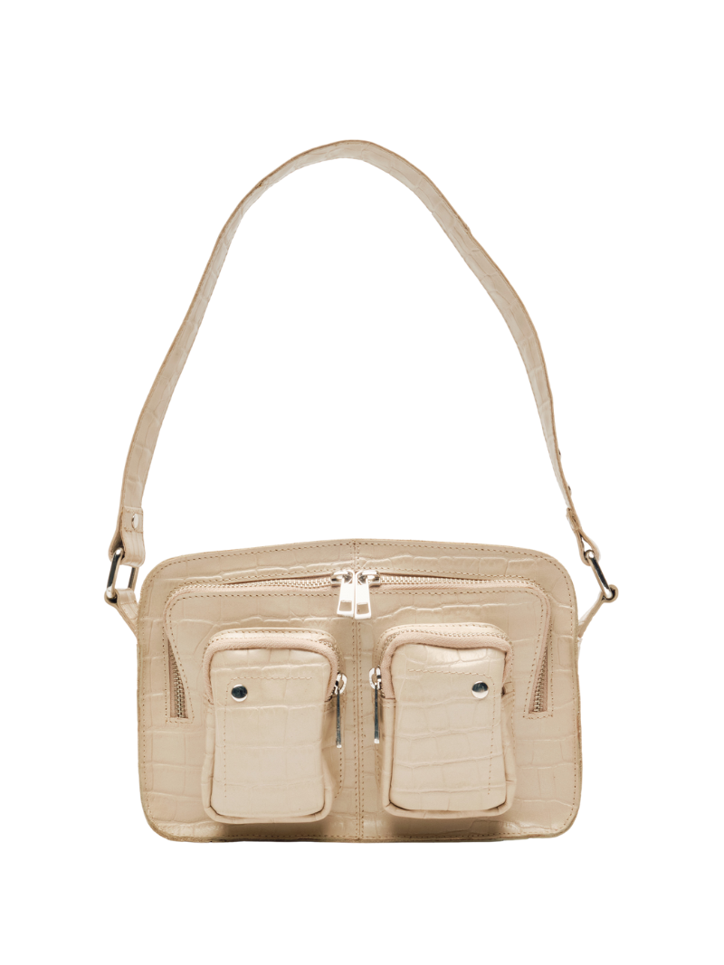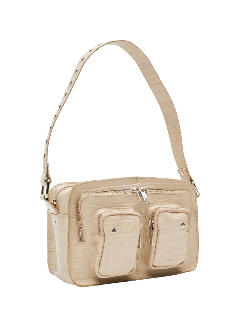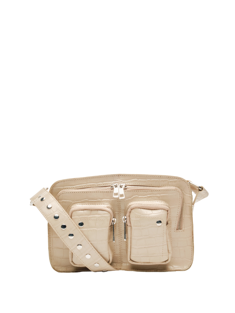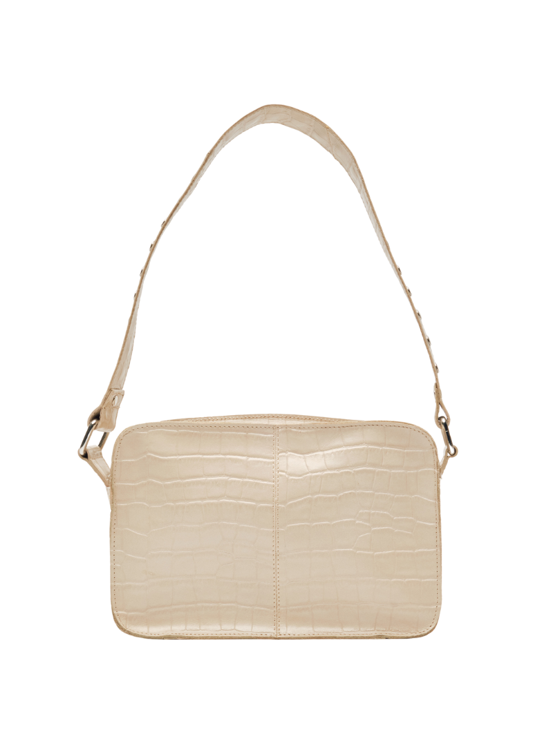 Medium-sized light gray leather bag with silver zippers and circular studs. A perfect medium-sized bag for your everyday life.