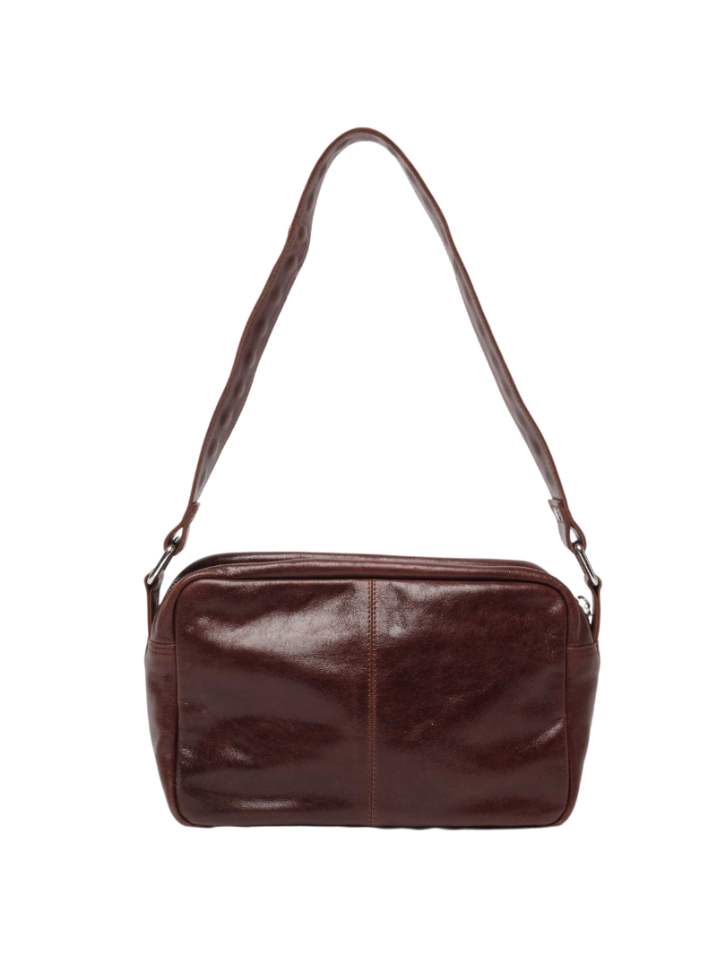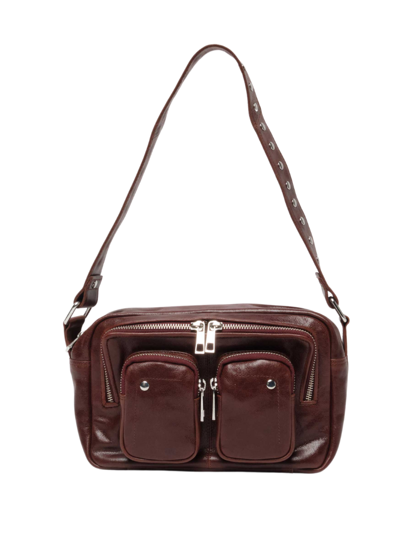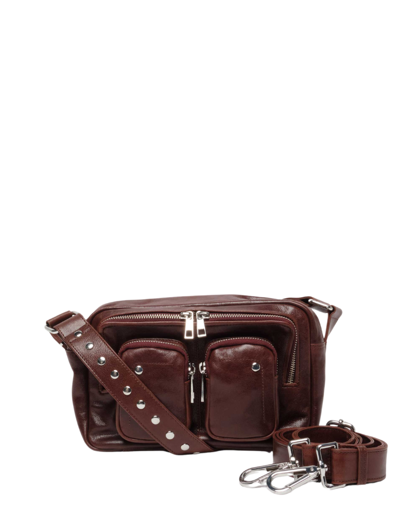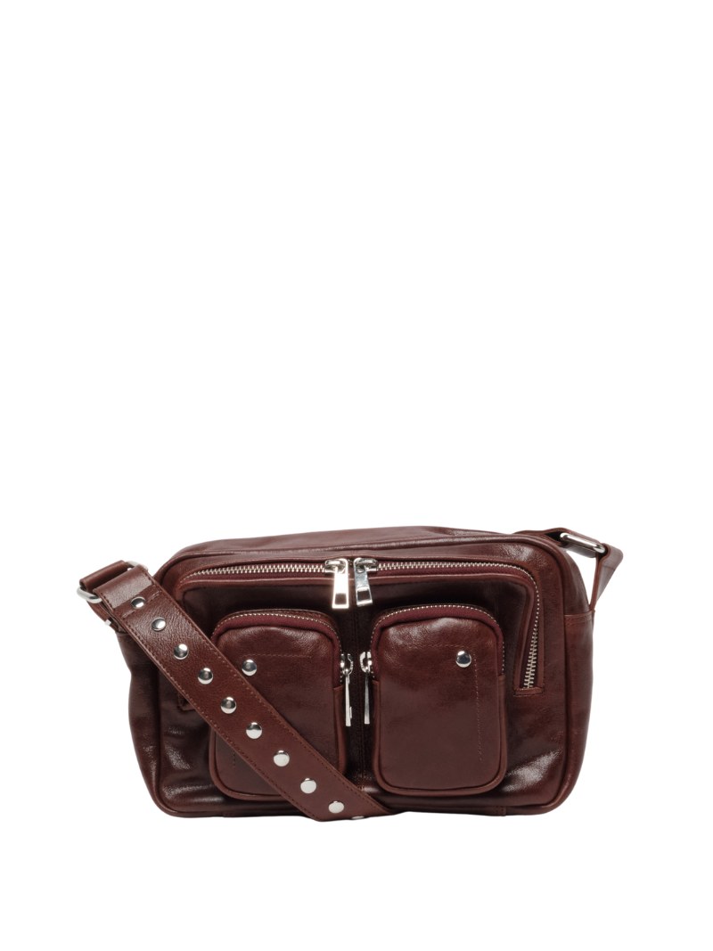 Medium brown leather bag with silver zippers and studs in the shape of a circle and stars. A perfect medium bag for your everyday life.