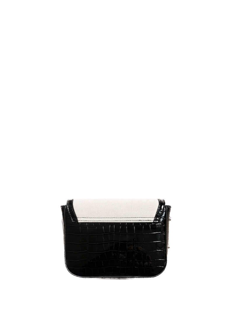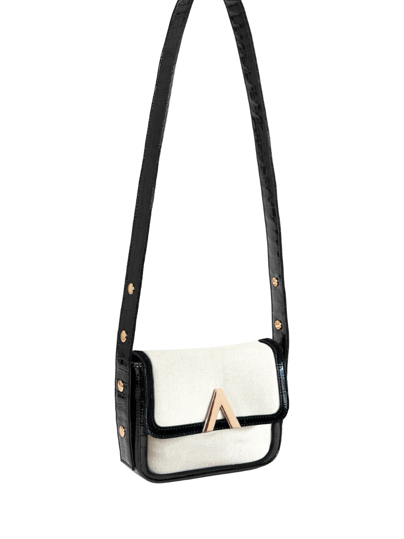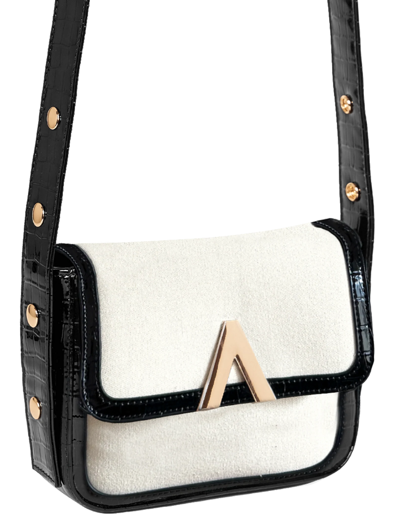 Small crossbody bag made from black vegan leather and white canvas. Decorated with the brand's logo on the front, an inverted V in gold.