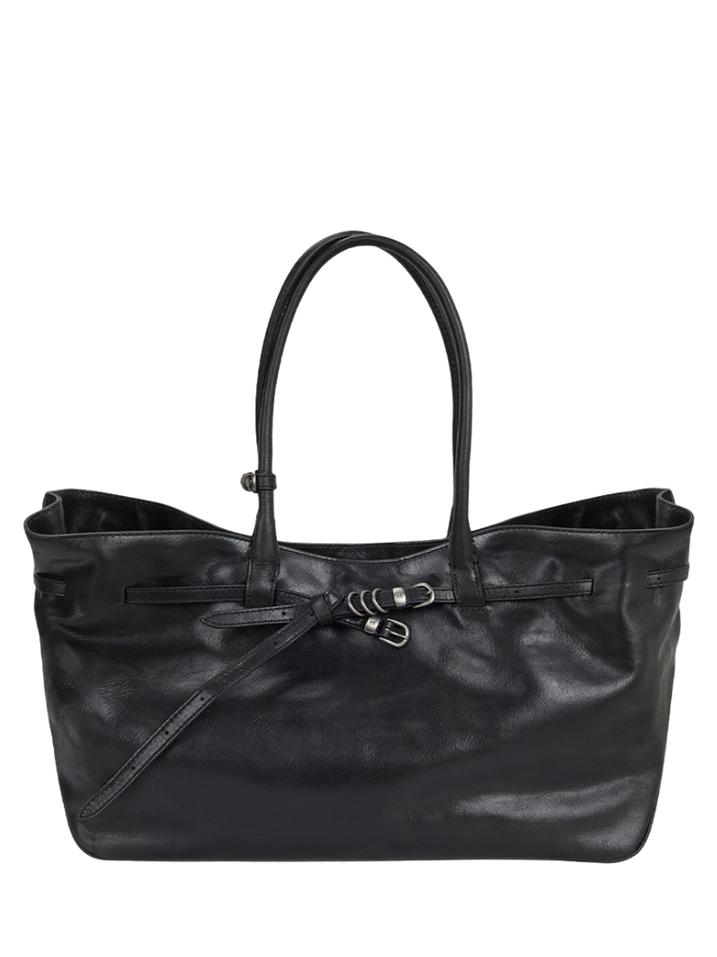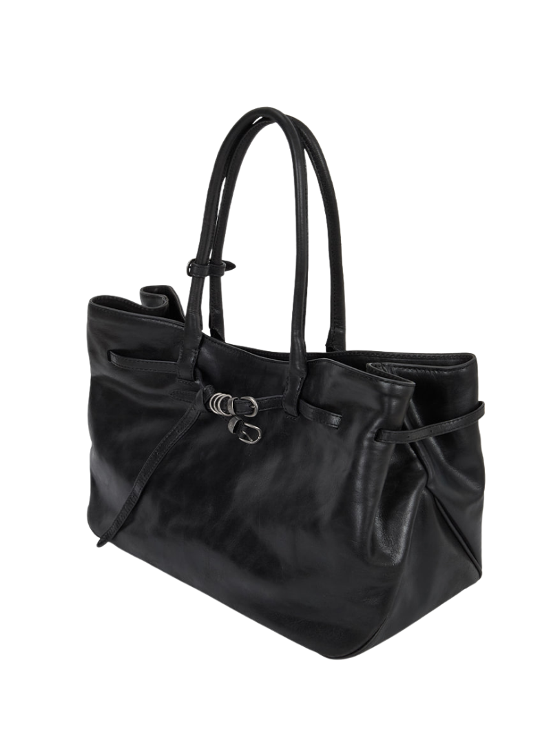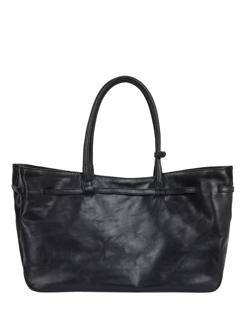 Large black leather bag with a pull-up finish by Margesherwood. This model stands out for its timeless, vintage-inspired design, reinterpreted with a contemporary twist. Made from leather with a natural distressed effect, it offers a look with unique character.