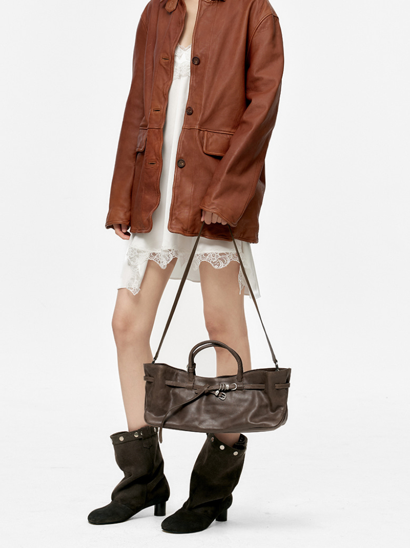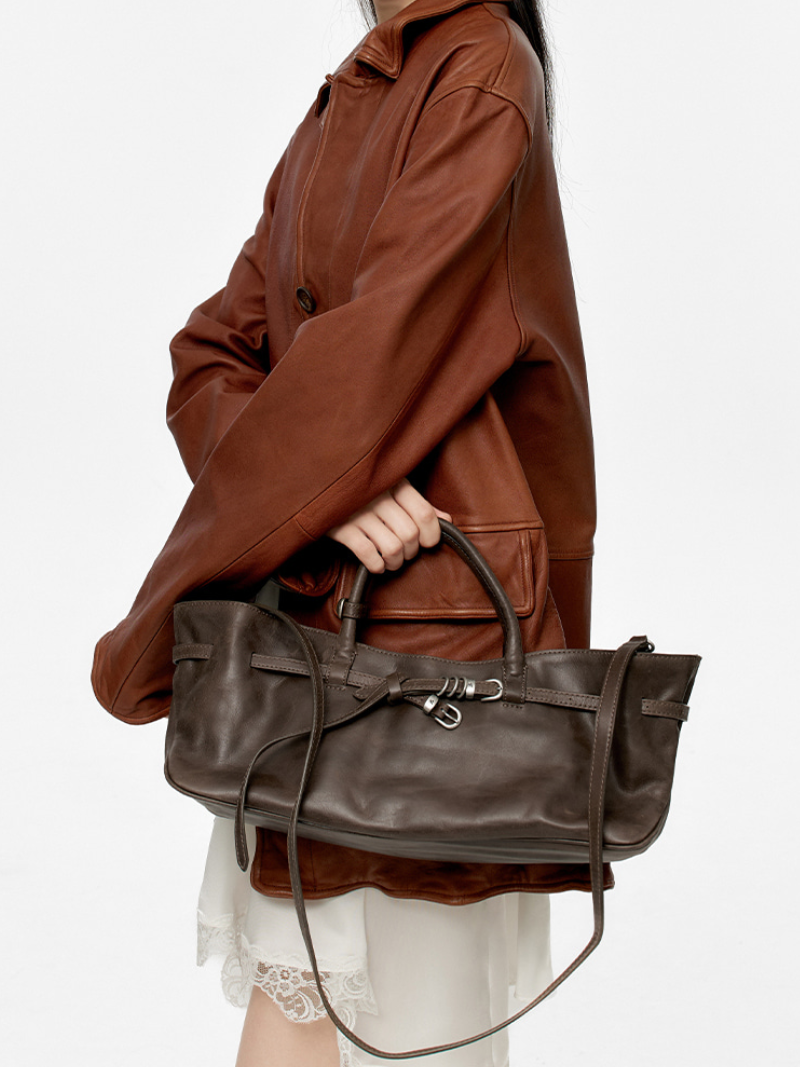 Medium brown leather bag that stands out for its modern and versatile design. It features a fixed tote-style top strap and a detachable shoulder strap, allowing it to be worn as a handbag or crossbody depending on the occasion. Its distinctive knotted belt strap adds a unique and contemporary touch. The cotton lining and internal pocket ensure functionality without sacrificing style.