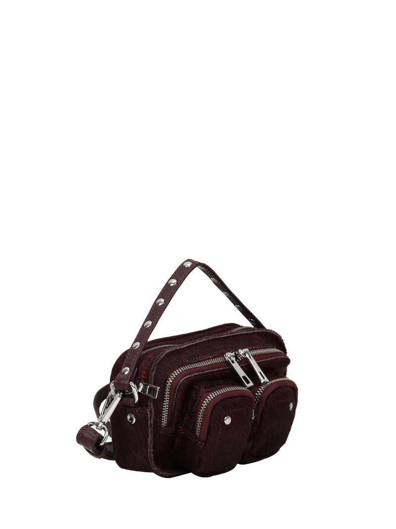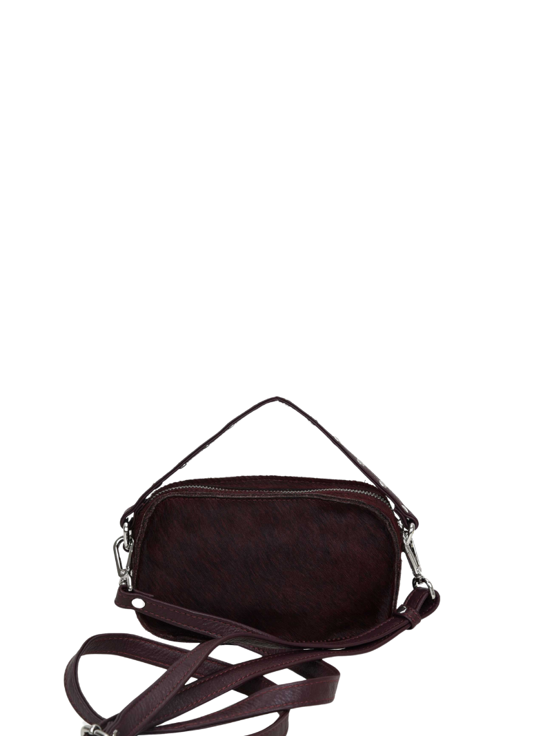 Small, furry burgundy leather bag with silver zippers and studs.