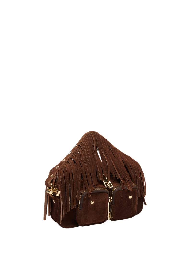 Small boho-chic suede bag in chocolate brown. This bag, called Helena, features fringes, the latest trend this year.