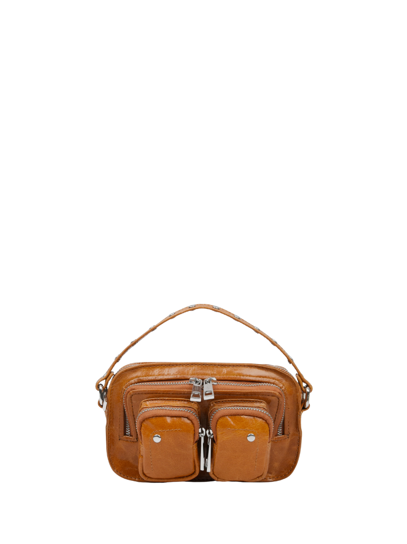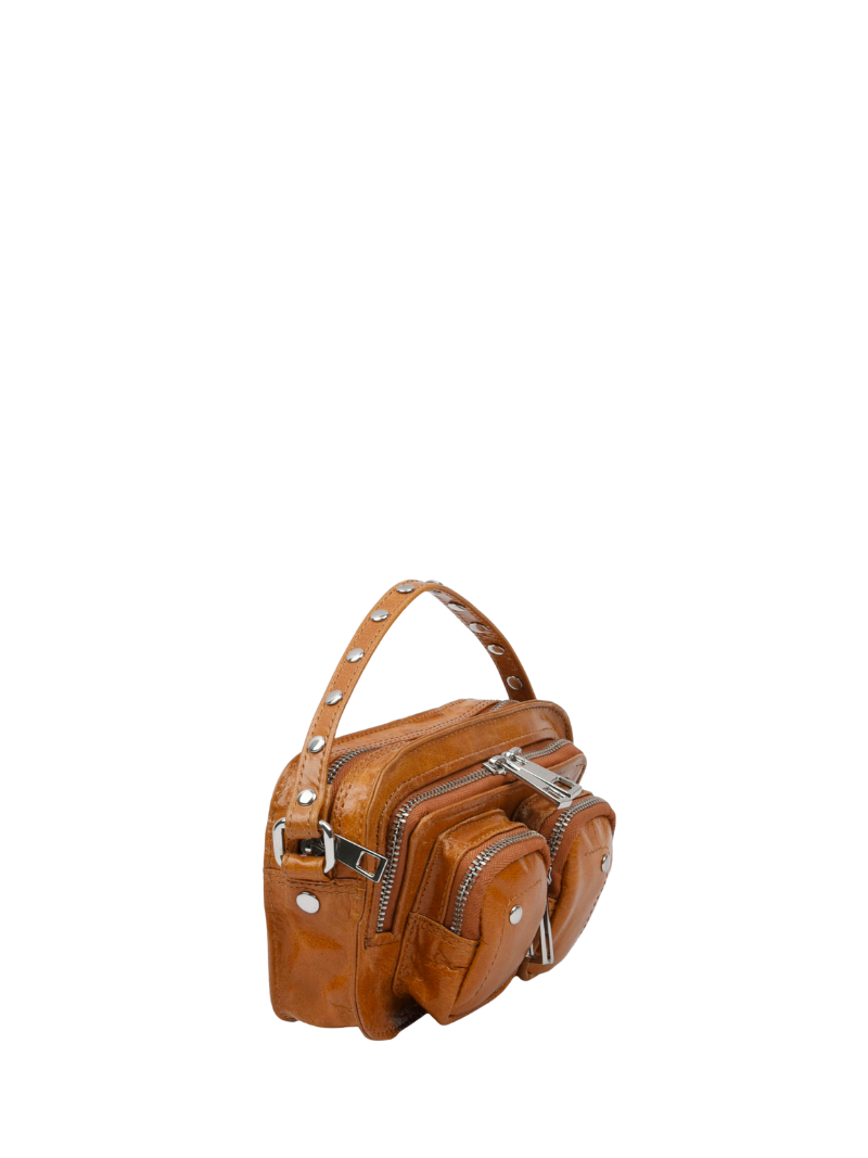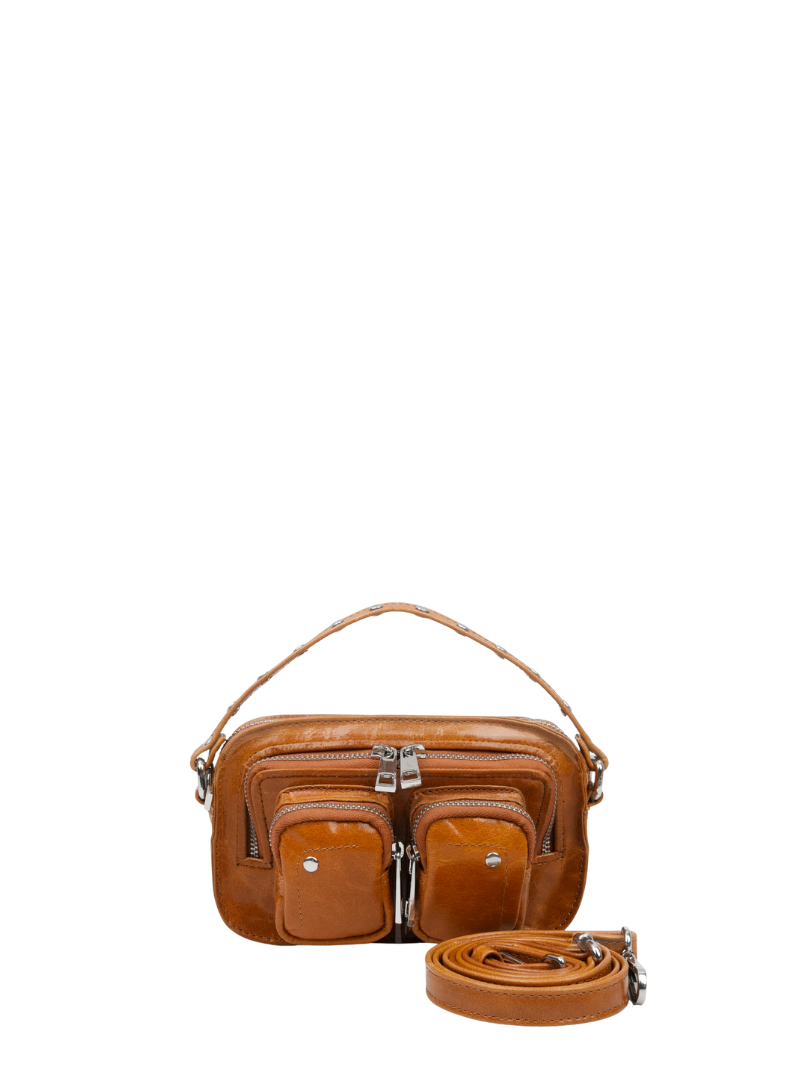 The Helena model by Núnoo perfectly fits a cell phone, wallet, keys, lipstick, or similar. It has several compartments and three straps: a short, studded leather strap for carrying by hand, a long, removable chain, and another, also removable and adjustable, leather strap for wearing across your body.