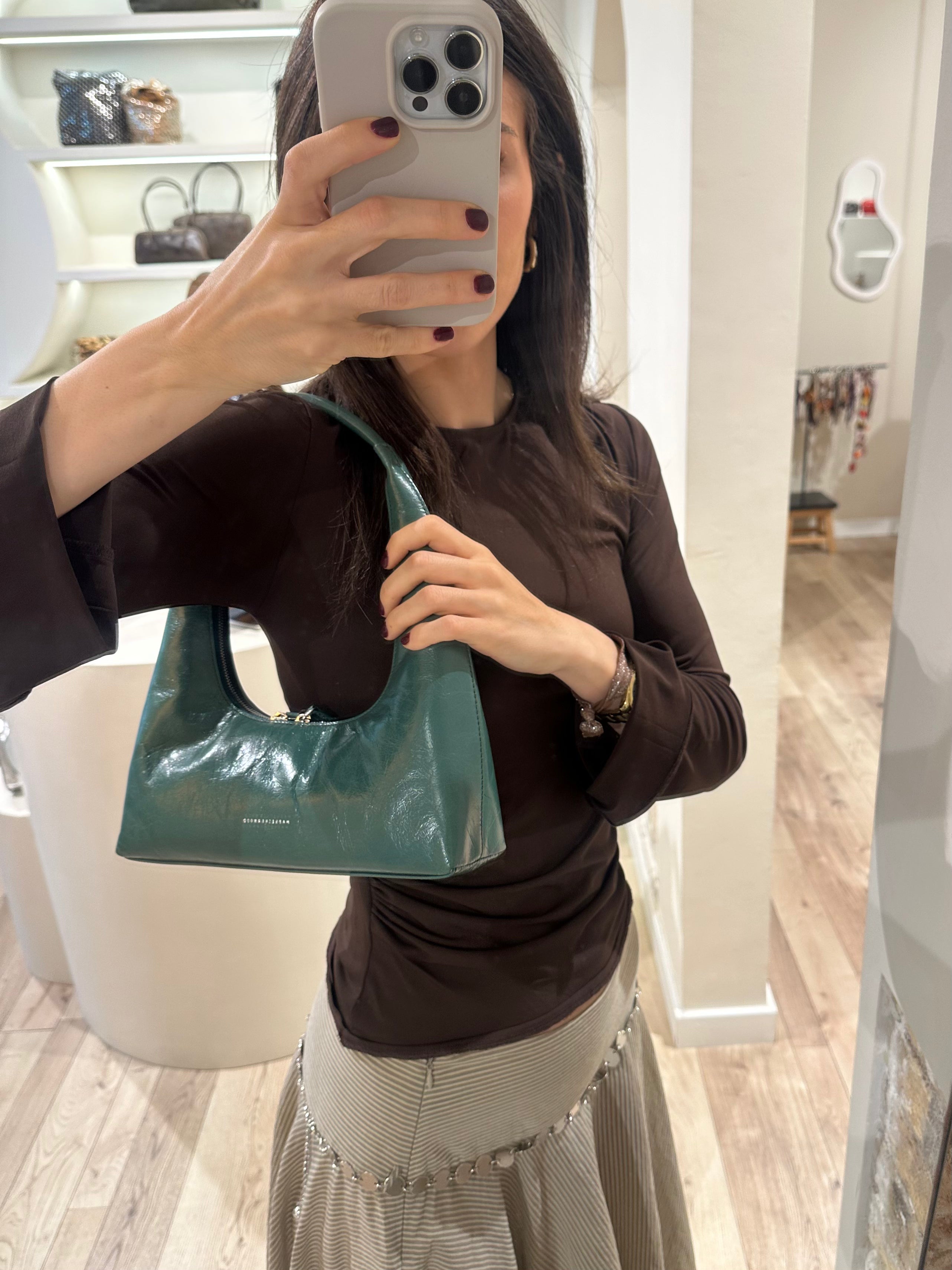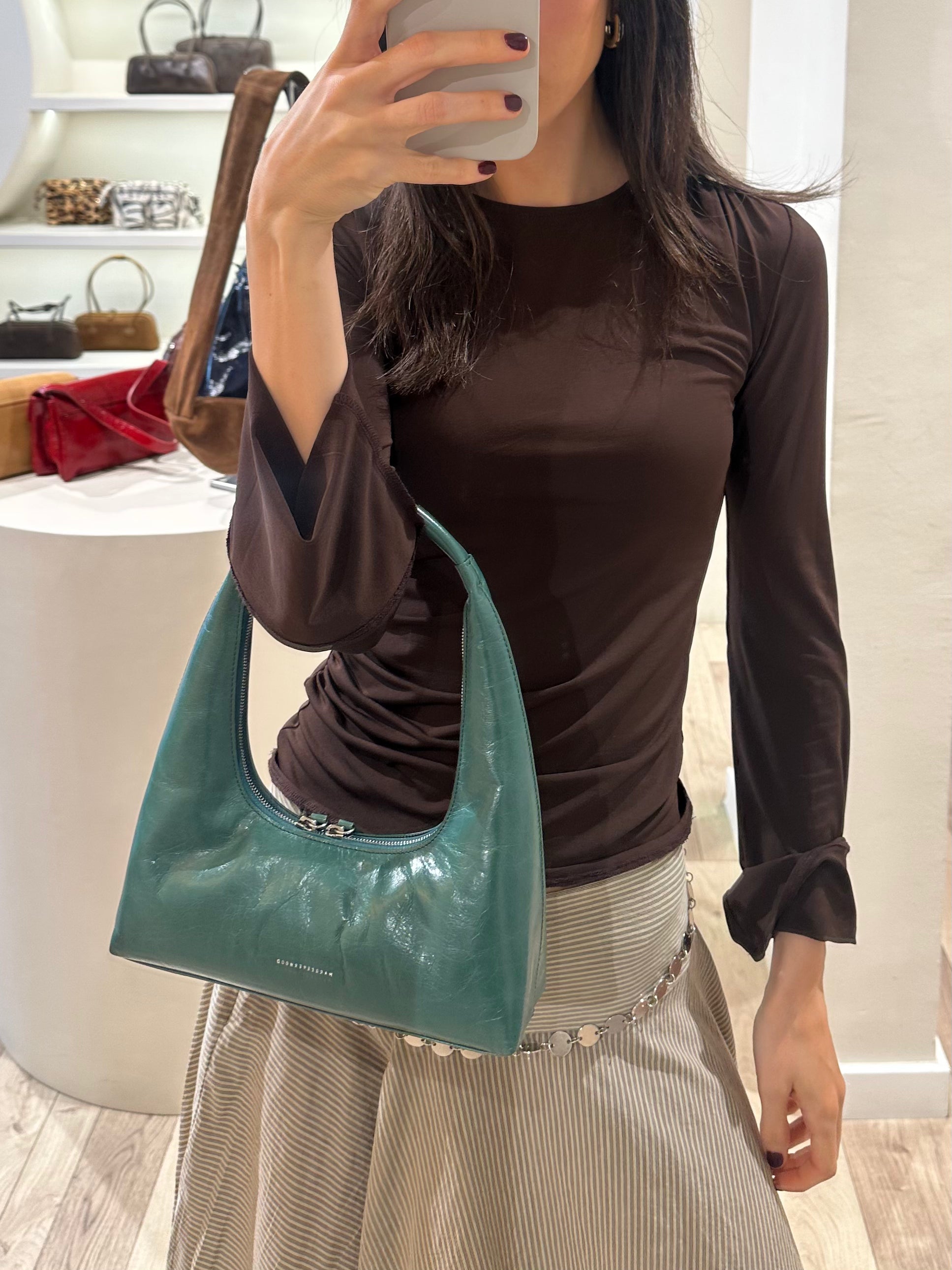 Green leather shoulder bag with the brand name engraved in silver on the front.