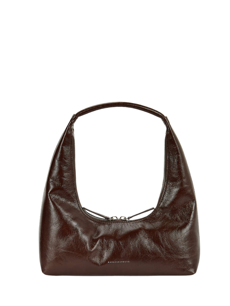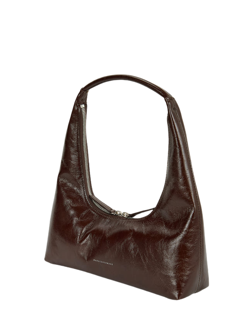 Bag chocolate brown leather shoulder bag, with the brand name engraved in silver on the front. This elegant model fits comfortably on the shoulder and features a minimalist and contemporary design.