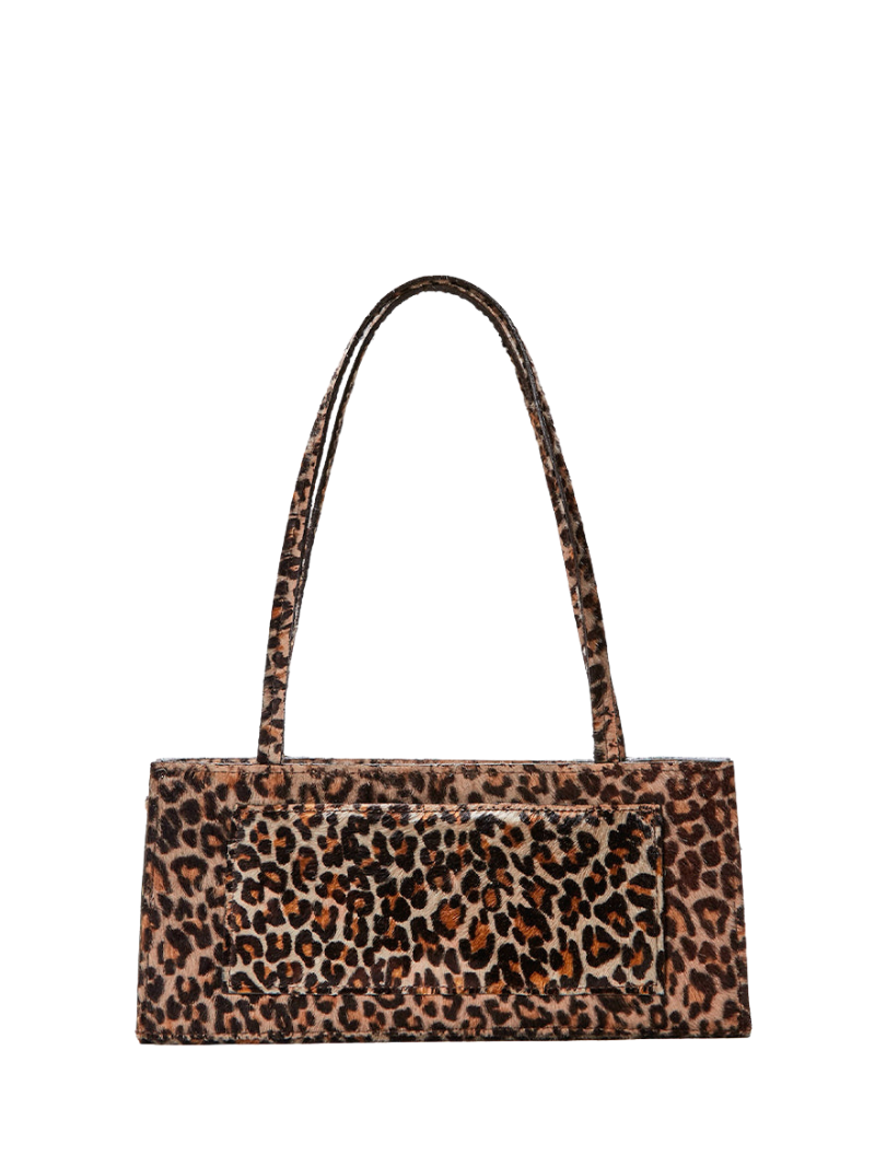 Small shoulder bag, baguette style, in leopard print. The Hot dog model is made of leather with a patent leather finish, which gives it a shiny appearance, but with great softness and luminosity.