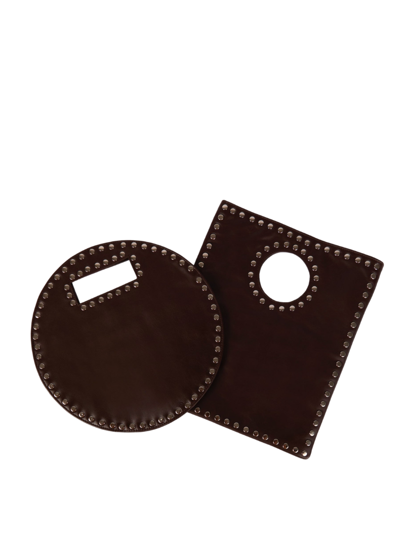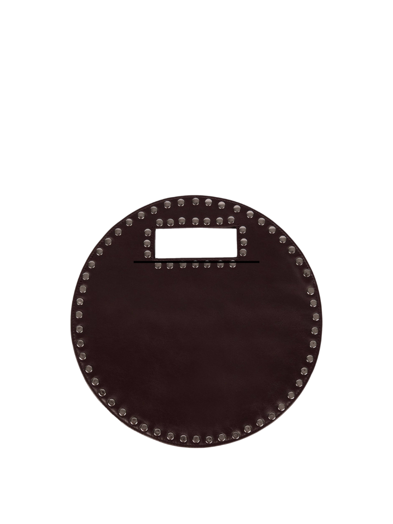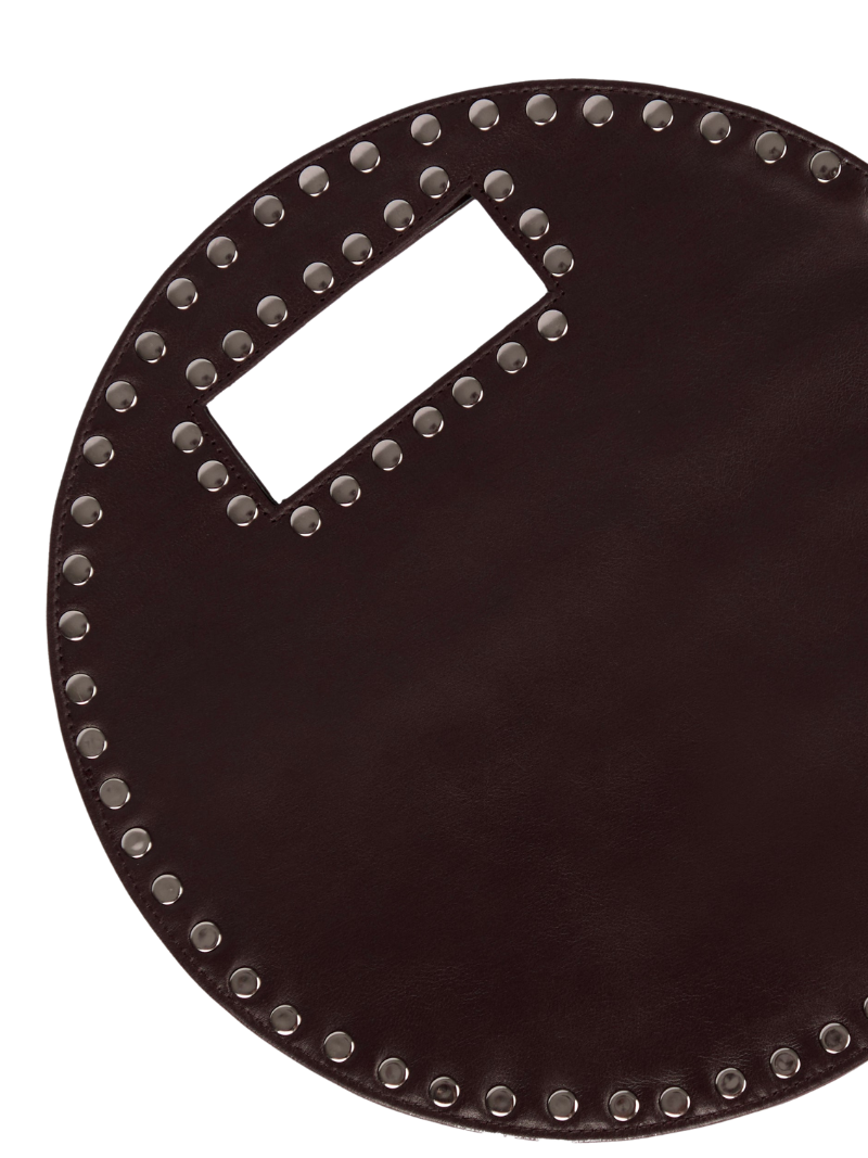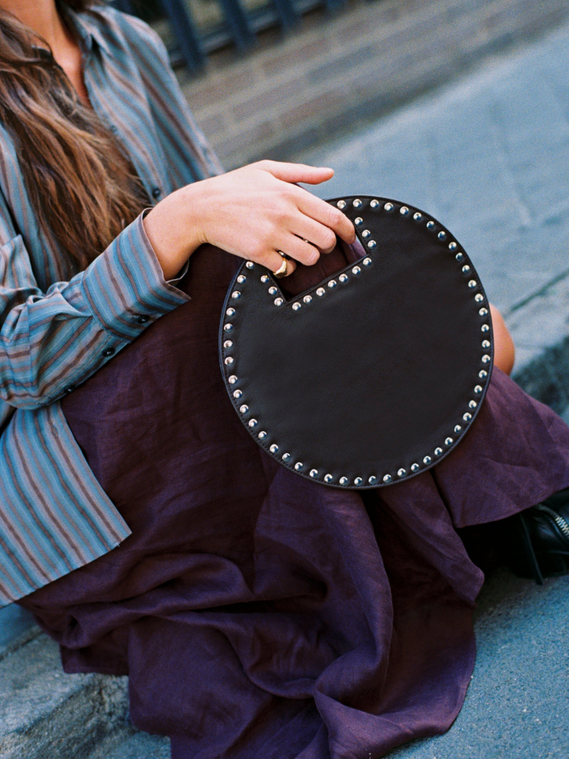 The Lennox handbag stands out for its unique circular shape and modern design, embellished with metallic studs around the edge and handle, giving it a touch of character and sophistication.