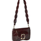 Medium-sized garnet crossbody bag with a crocodile-effect finish and the signature melted metal closure on the front, one of It’s Lava’s most recognizable details.
