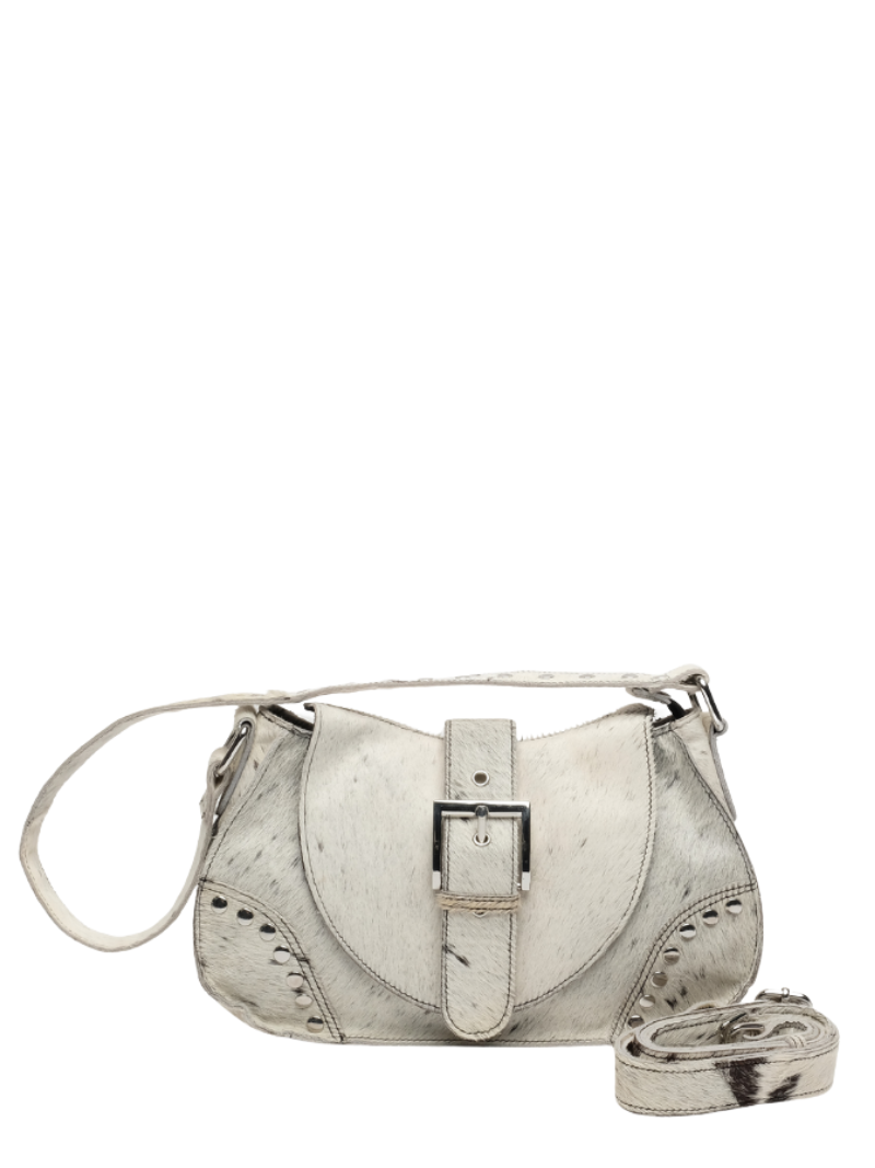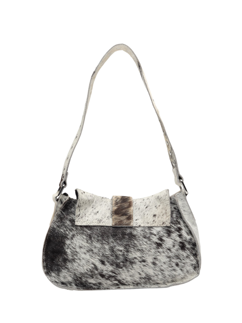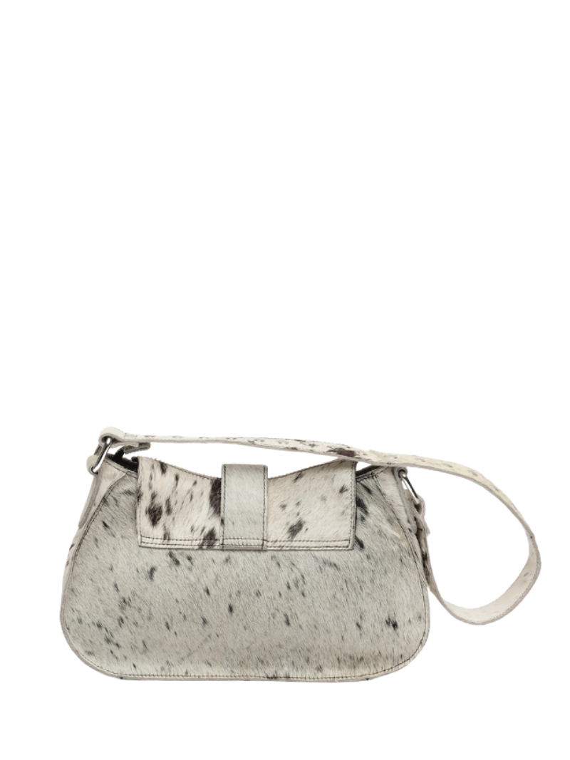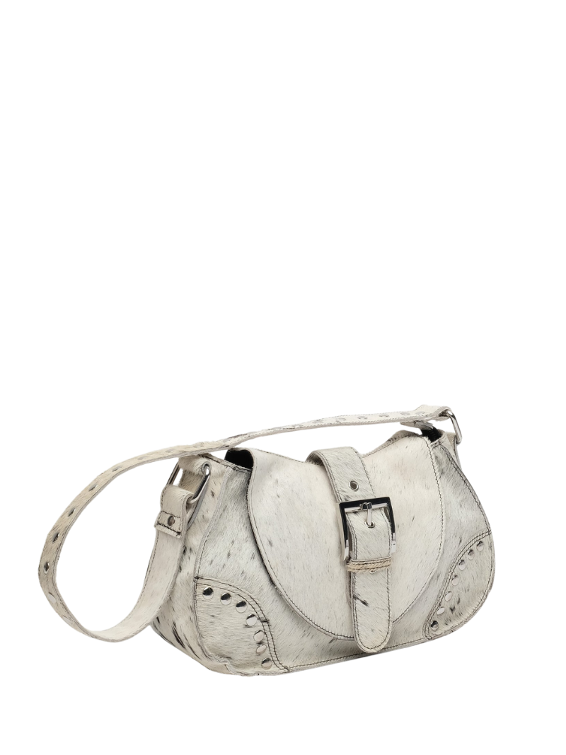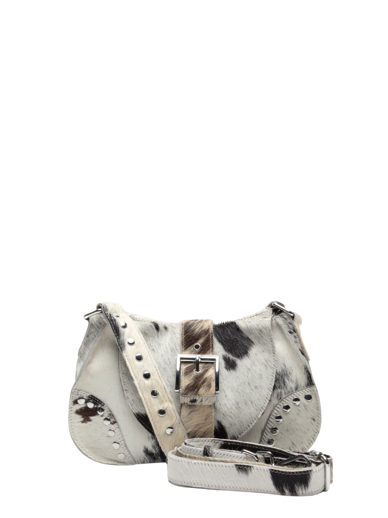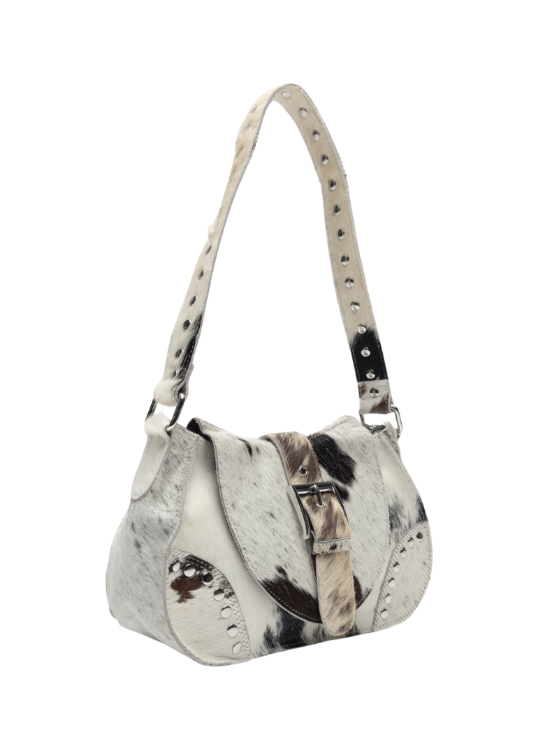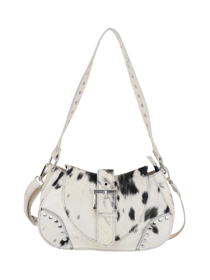 Núnoo's Maria Rivet Black Dots leather bag features a black and white cowhide print, metallic details, and an adjustable double handle. An original and distinctive design that can be worn over the shoulder or across the body, perfect for enhancing any look.